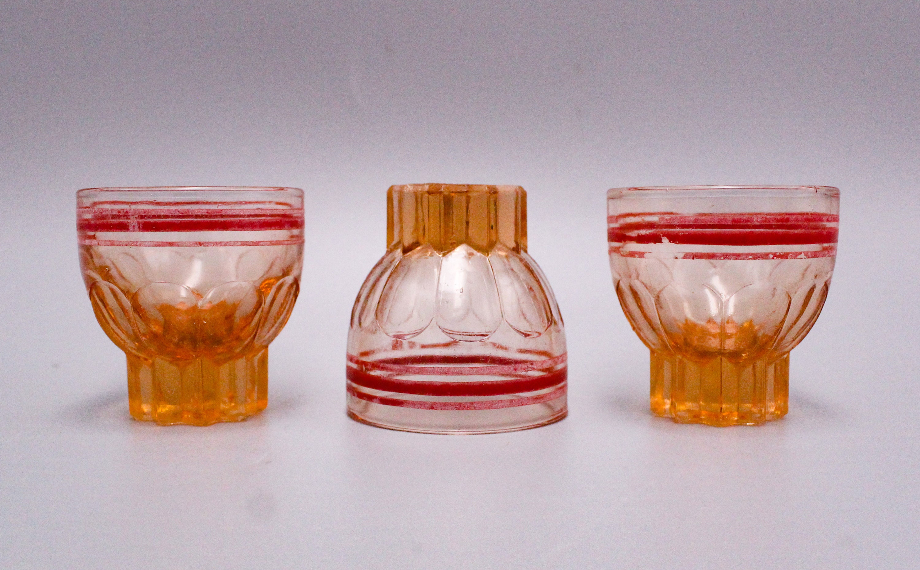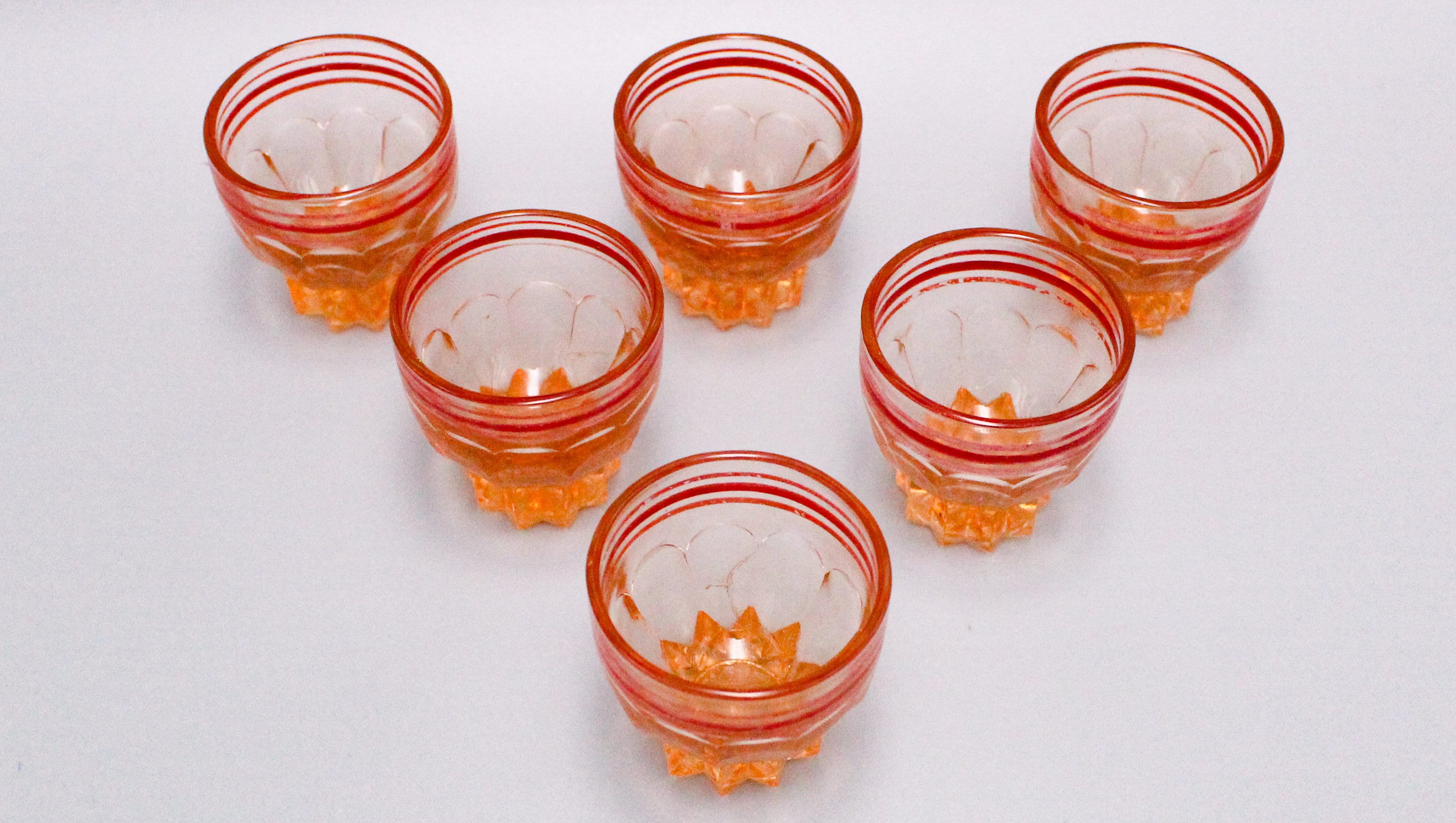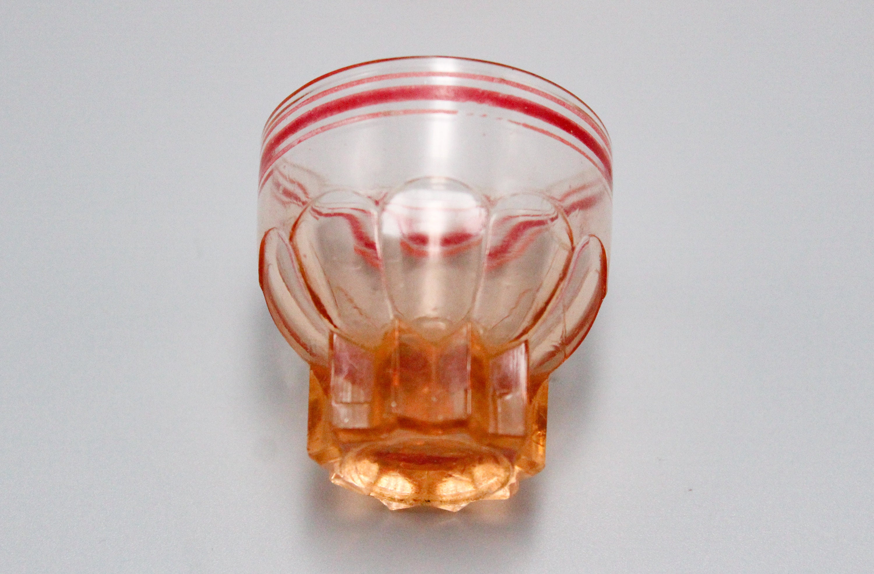Set of 6 retro pink glass glasses with red rim, 1950s liqueur glasses, molded pink glass.