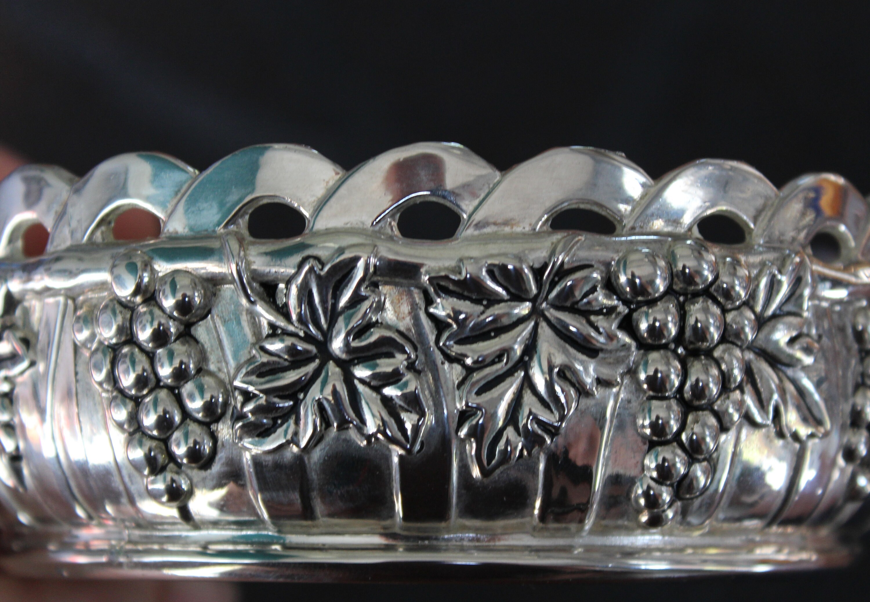 A lovely, very ornate bowl with a vine shoot with leaves and bunches of grapes around the edge.