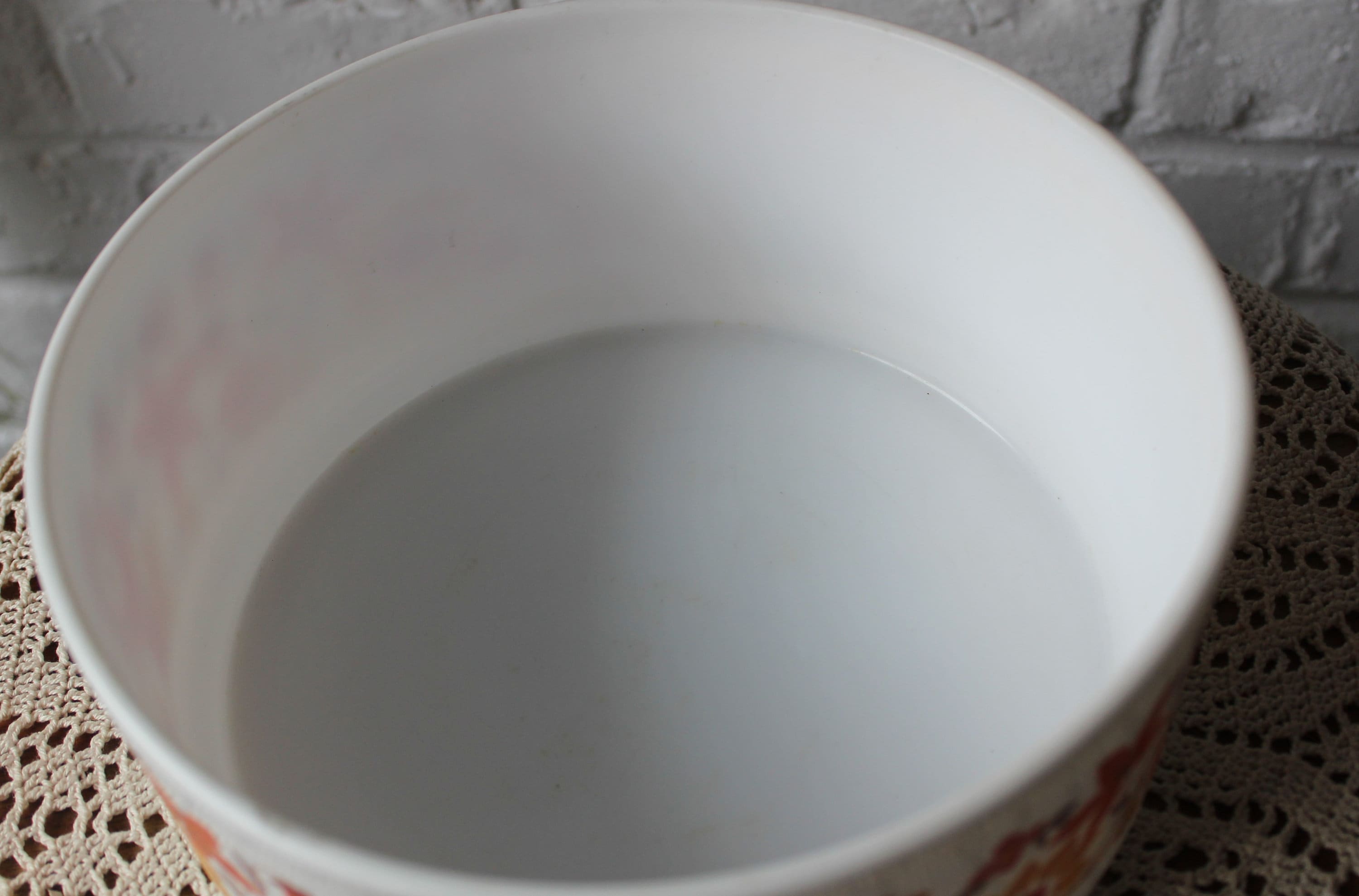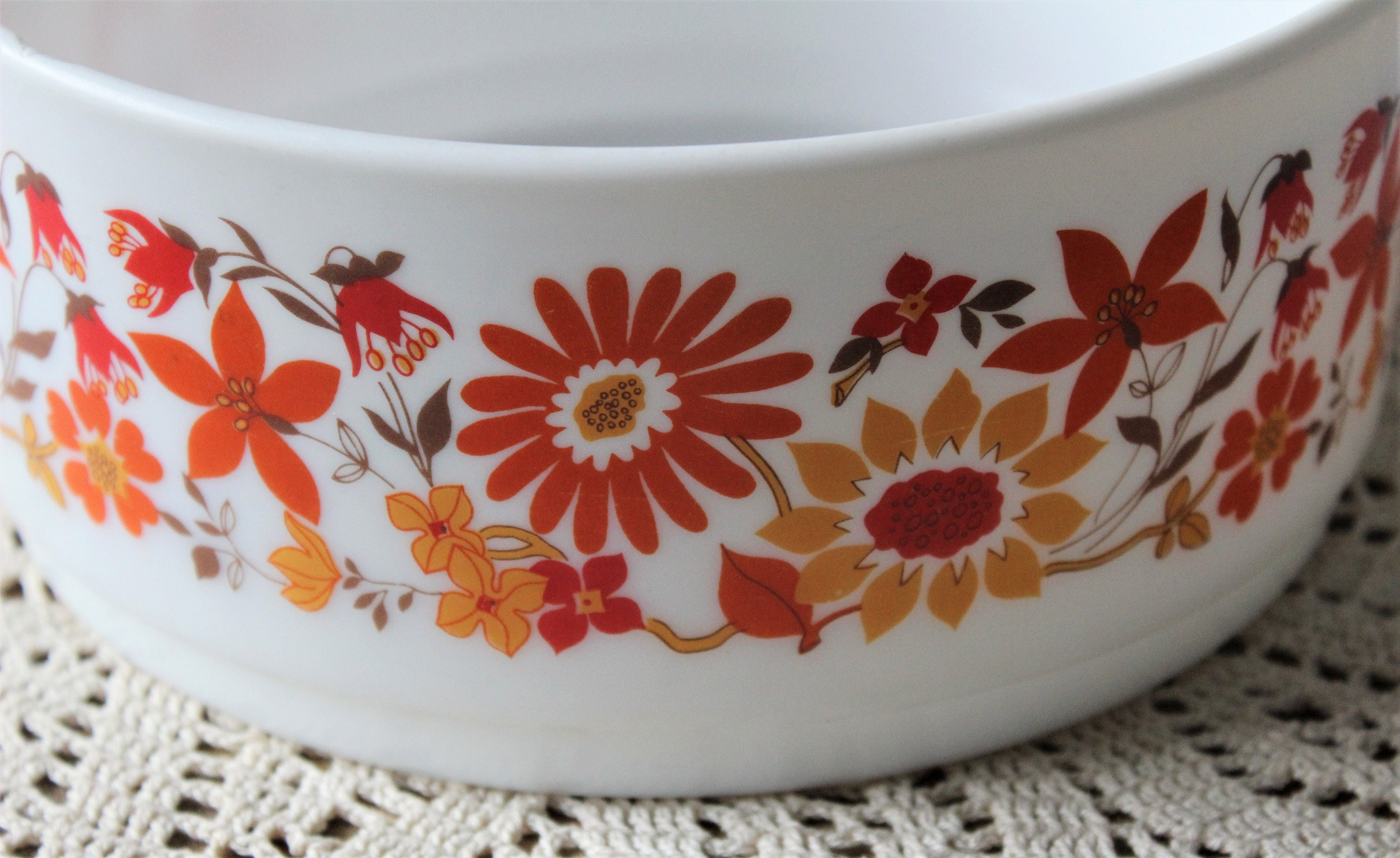 Very pretty orange floral patterns decorate this milk glass salad bowl, vintage from the 70s.