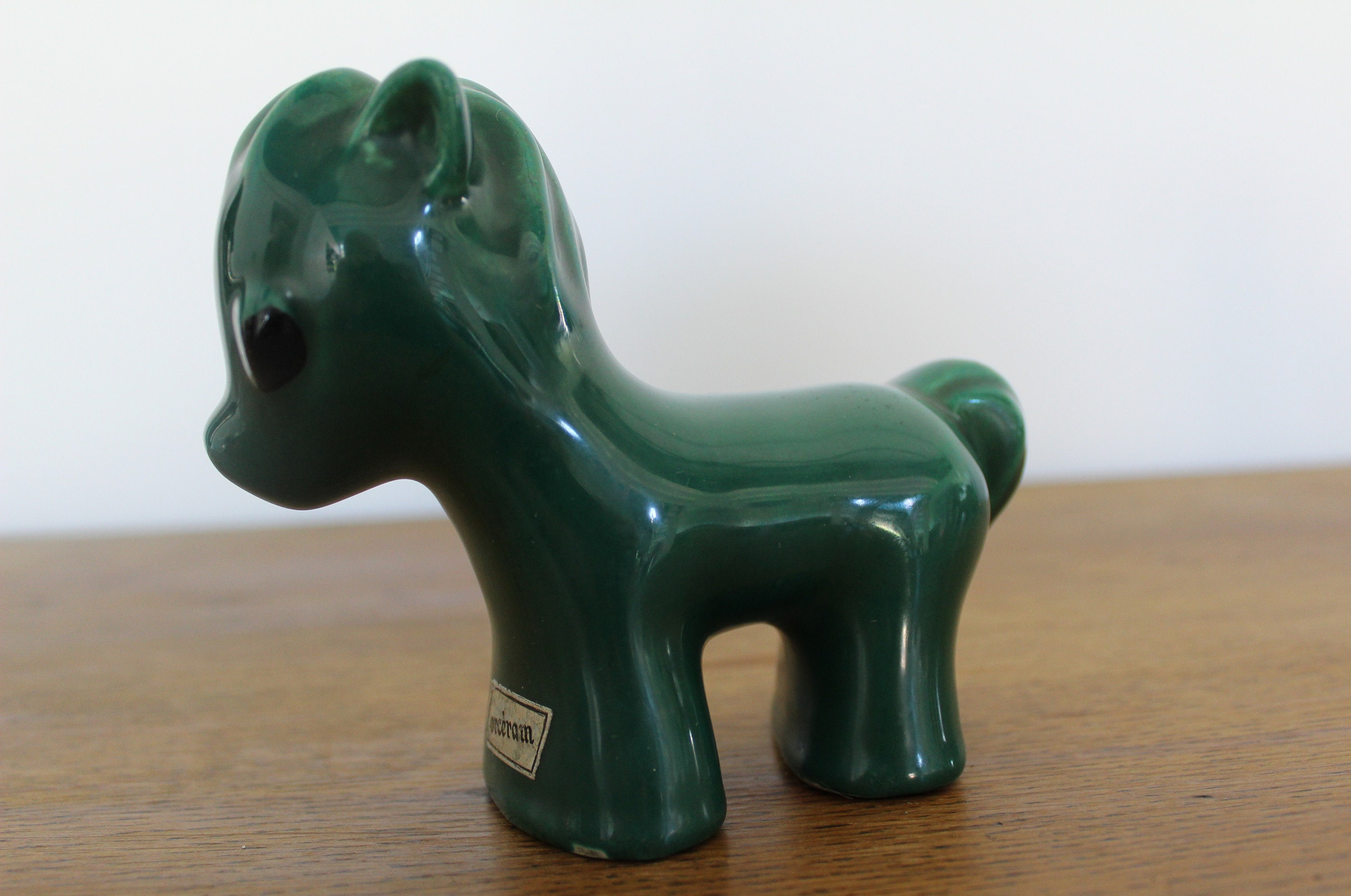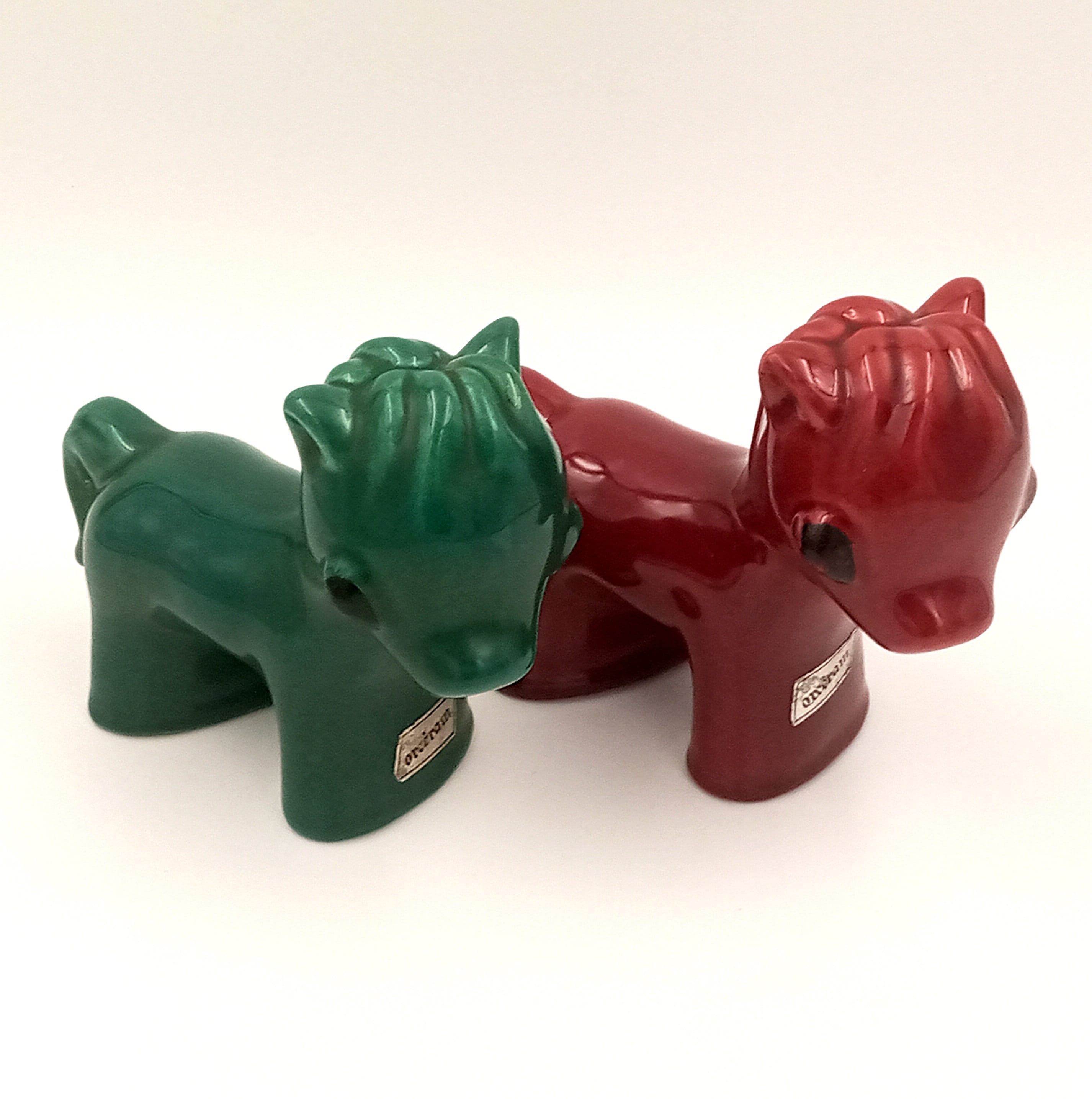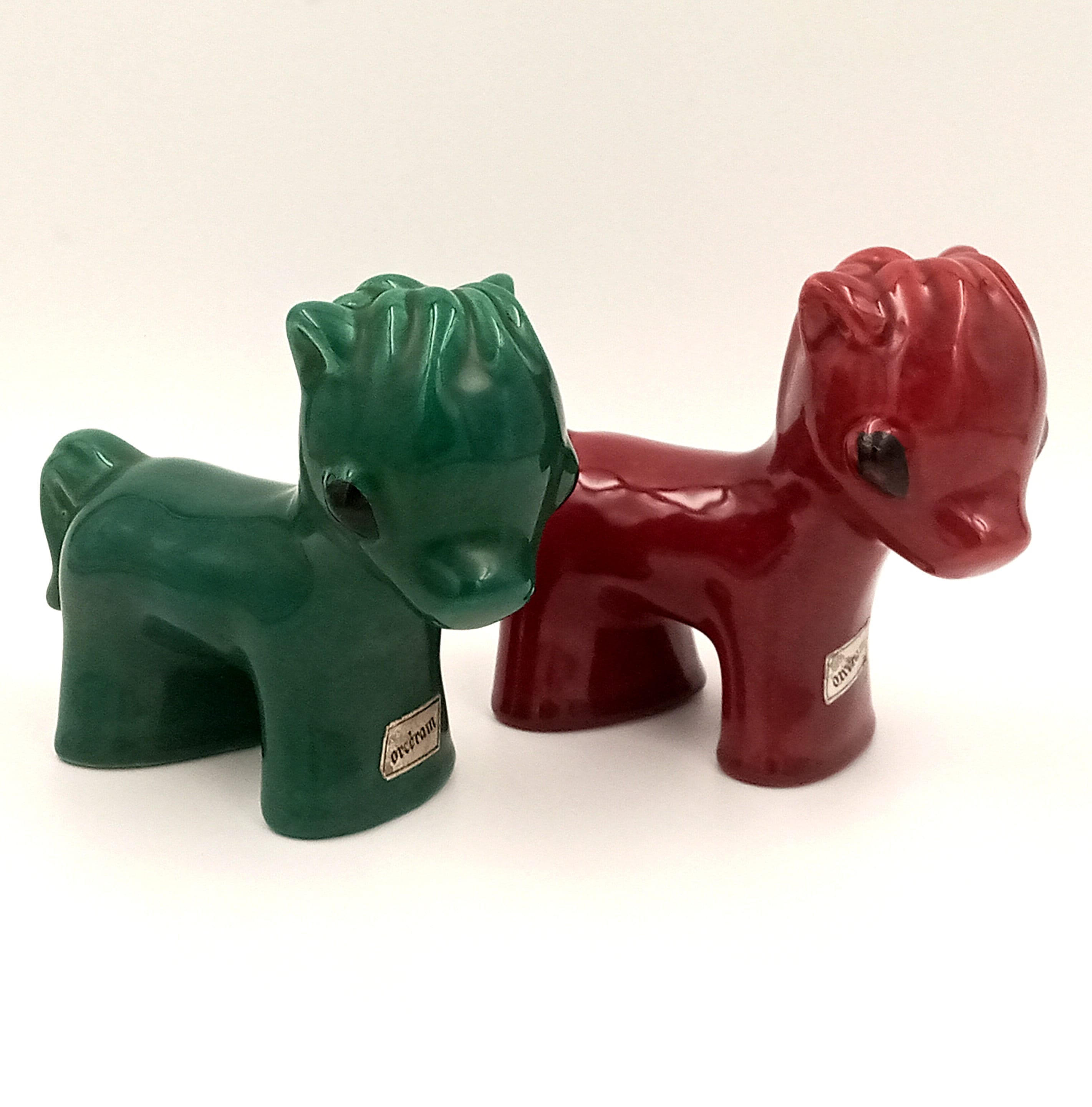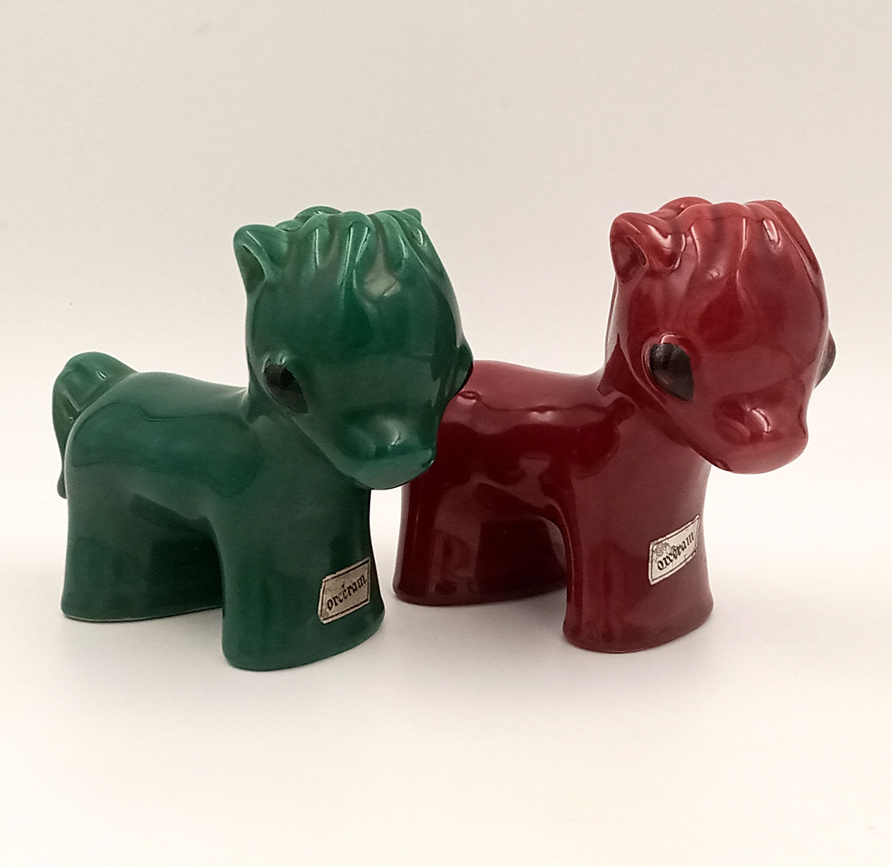 Charming pair of small horses, in green and red glazed ceramic, circa 50