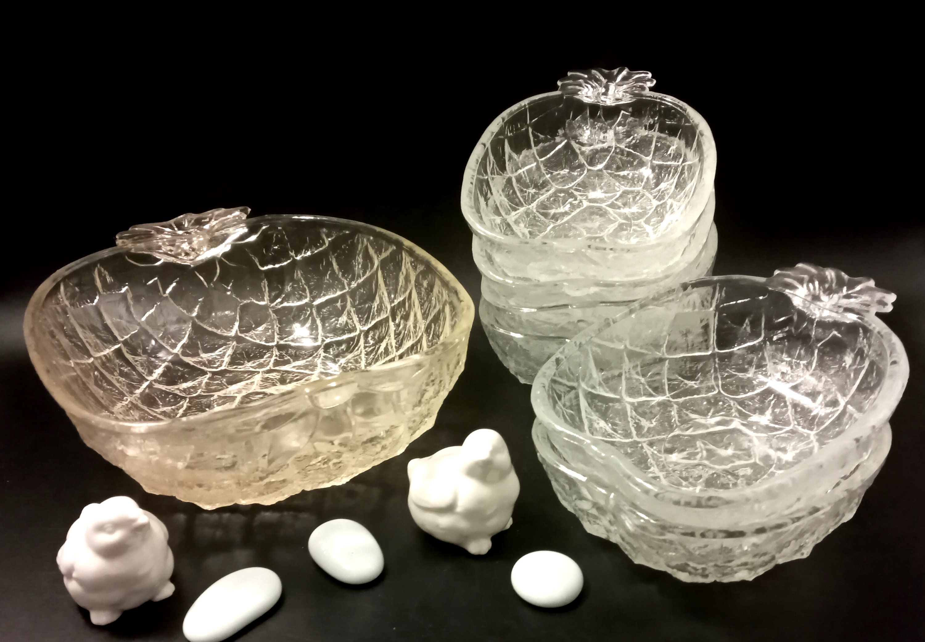 Set consisting of a salad bowl and 6 textured pineapple-shaped bowls.