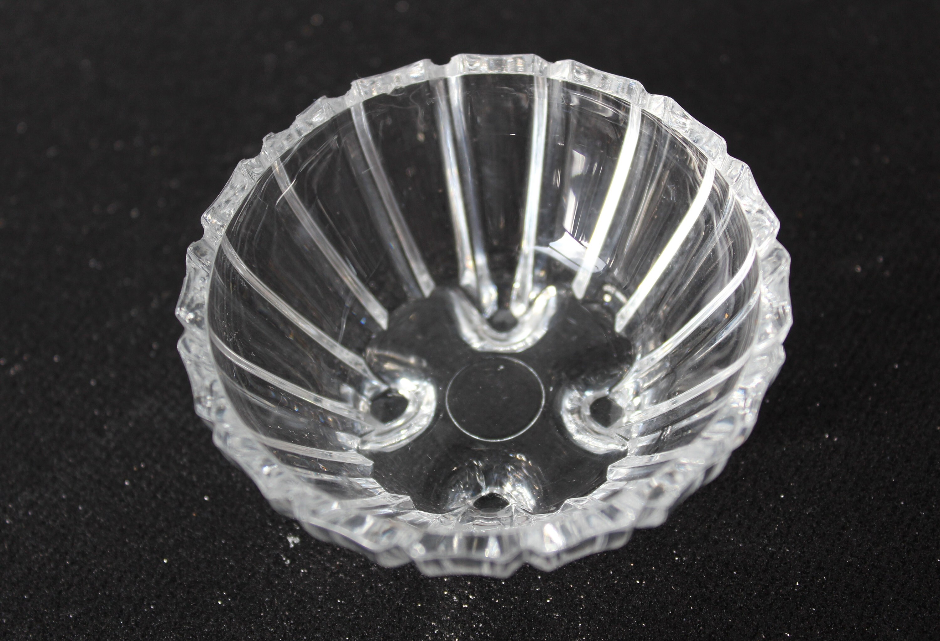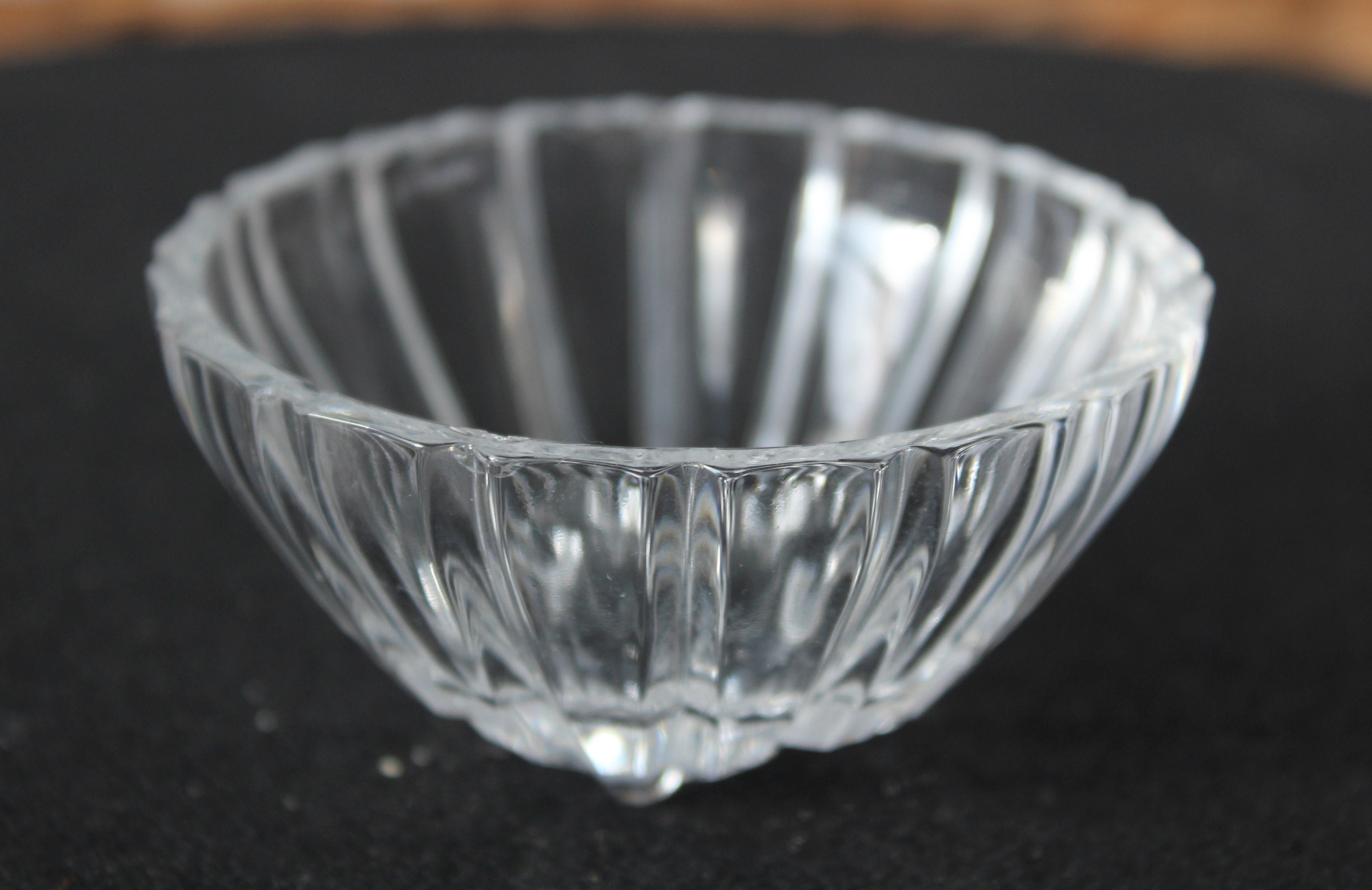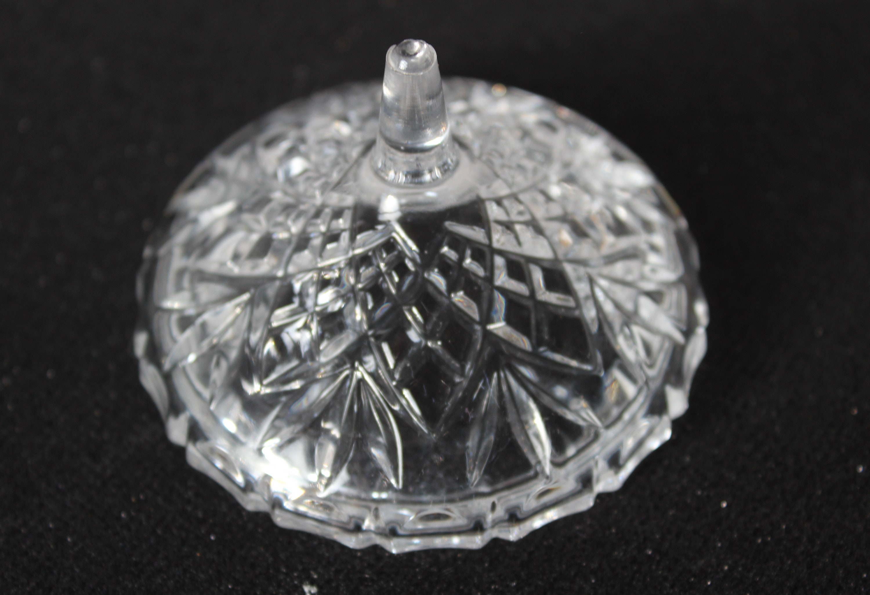 A lovely pair of small crystal boxes with lids. The bowl has a simple design of vertical lines, while the lid is more elaborate. These containers would be perfect, for example, for storing your rings, earrings, etc., on a dresser, nightstand, or in the bathroom. They could also be used as salt shakers on a pretty table.