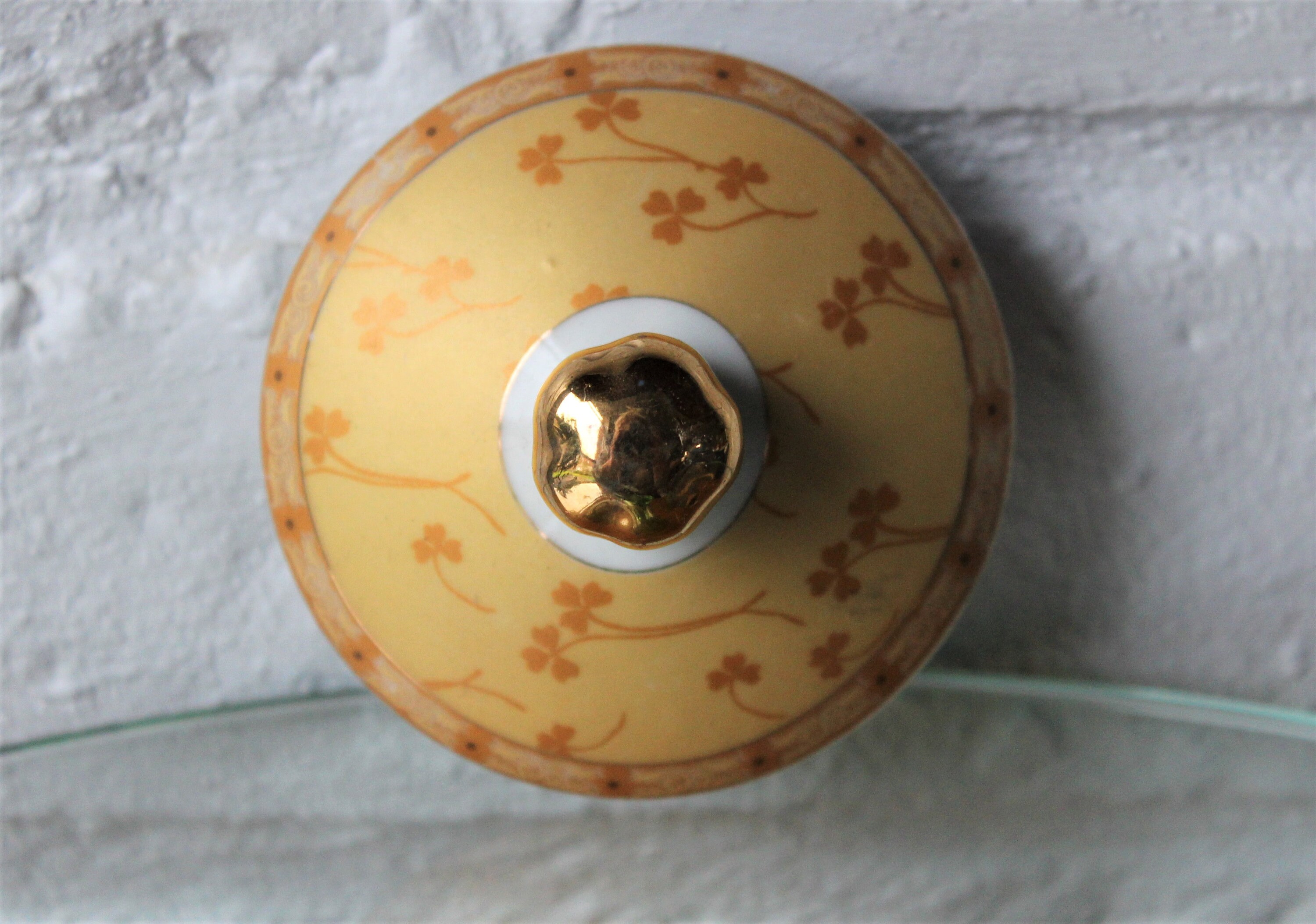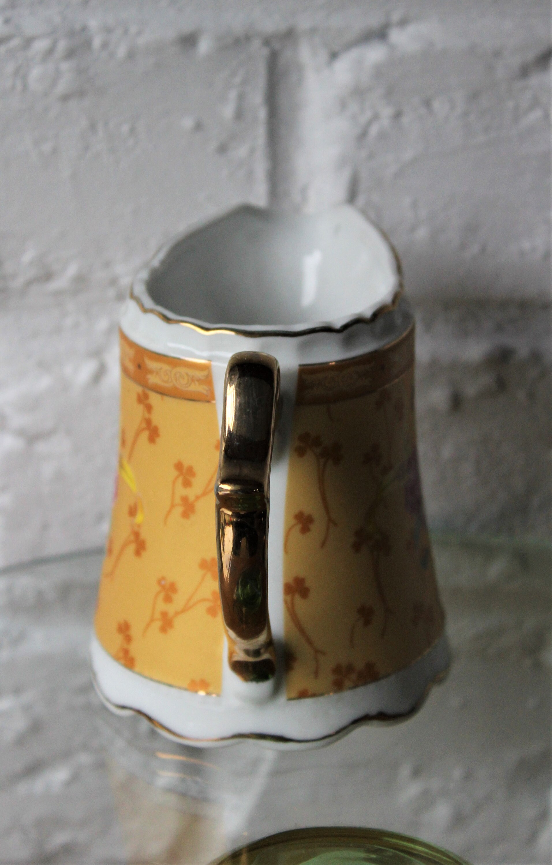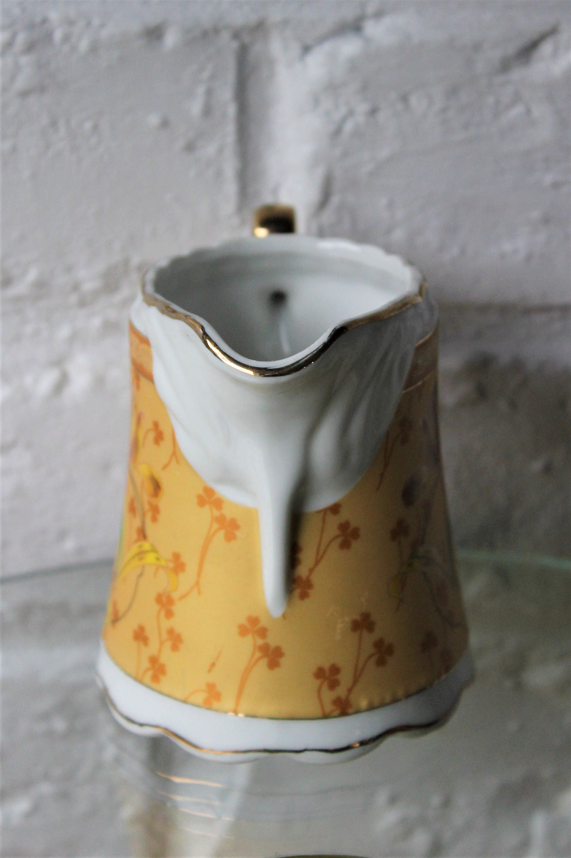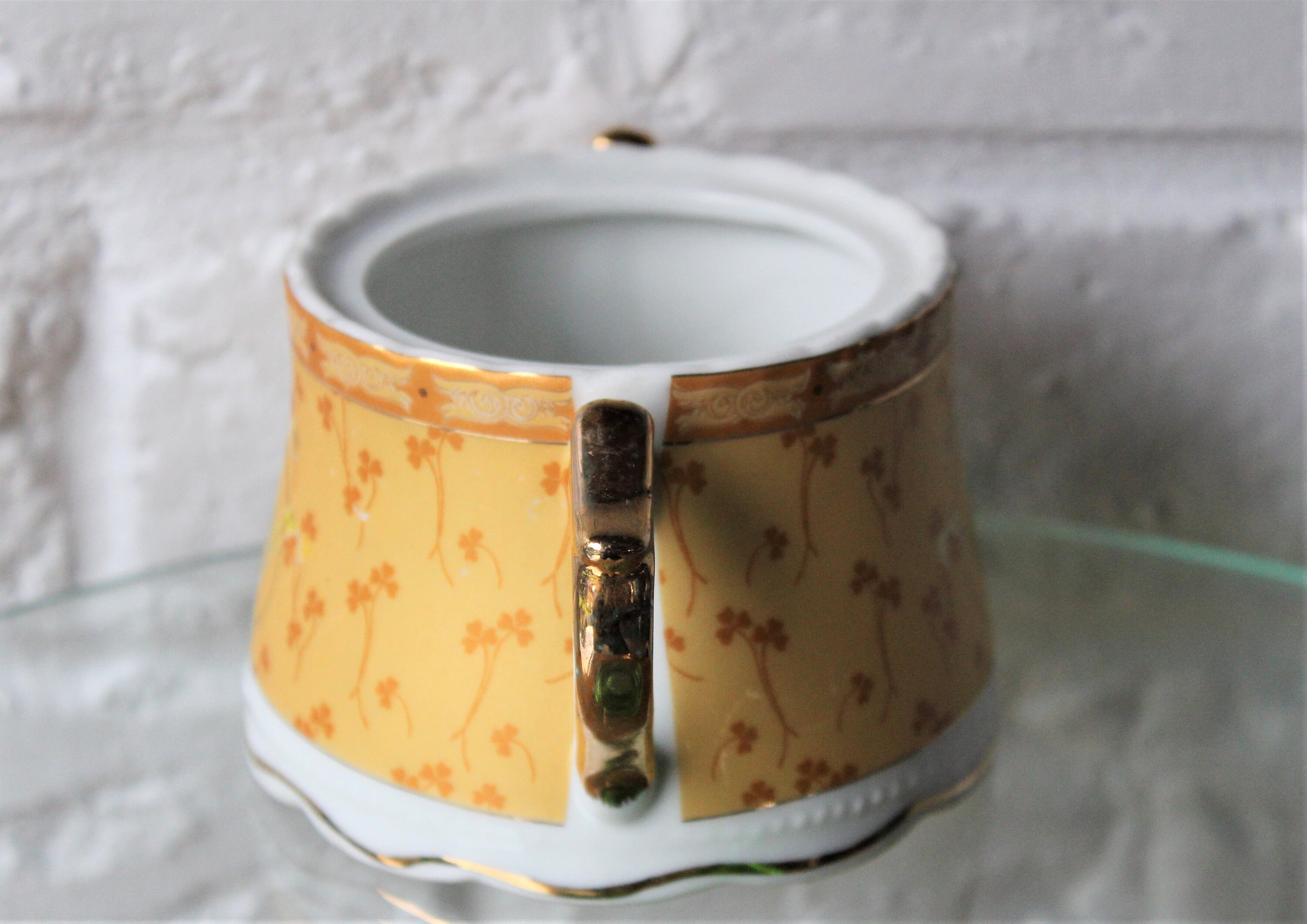 A very pretty set consisting of a sugar bowl and a milk jug, yellow with clover decoration, flowers and gold trim.