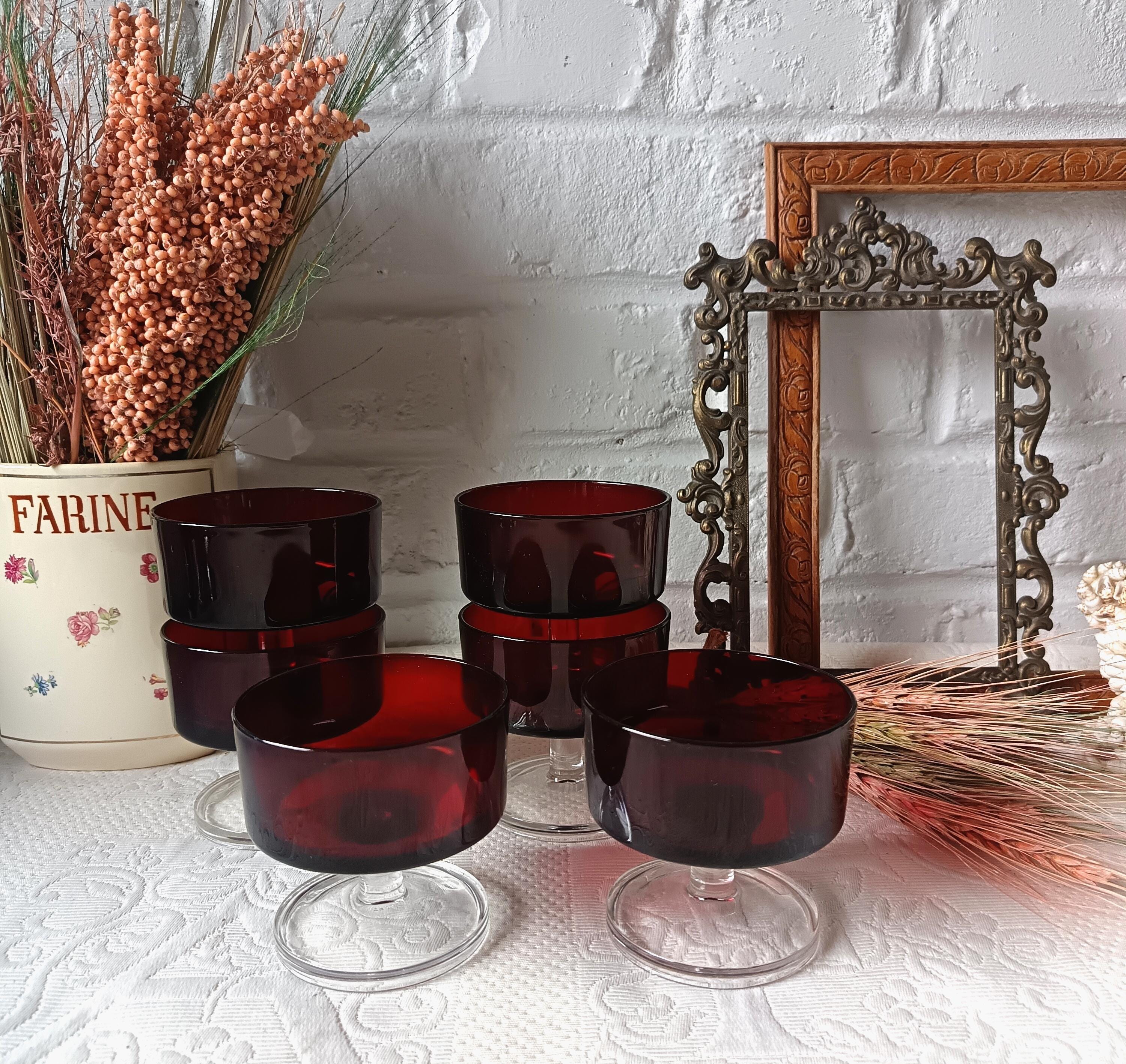 Set of 6 large vintage French stemmed bowls, Luminarc suede model in ruby red colour, dating from the 1970s.
