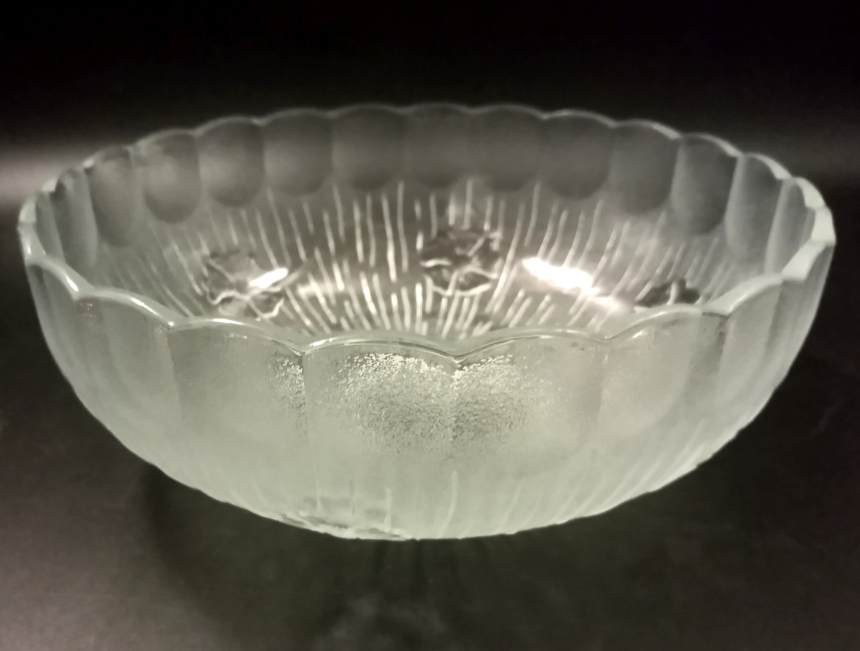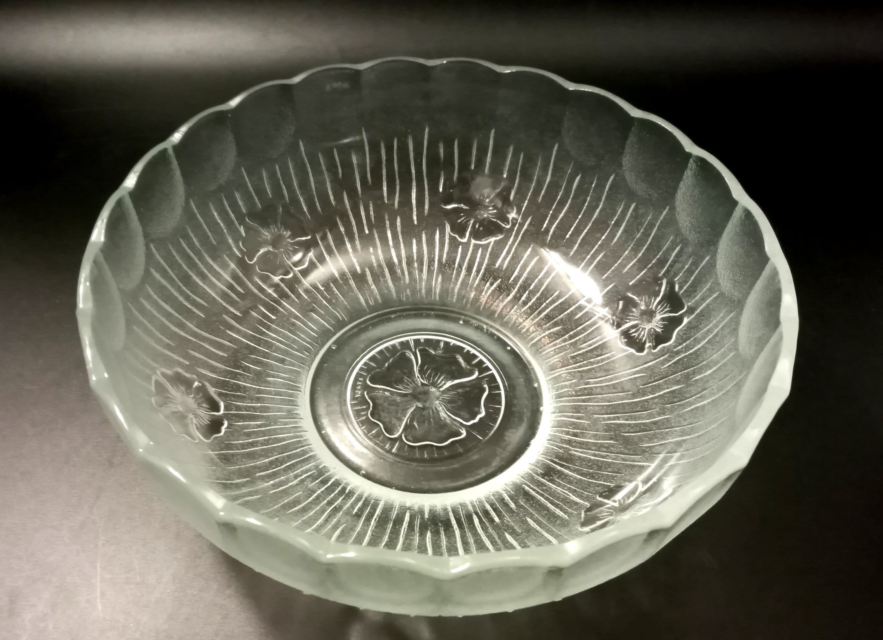 A pretty, medium-sized, transparent salad bowl that is very decorative, with a pattern combining lines and flowers.