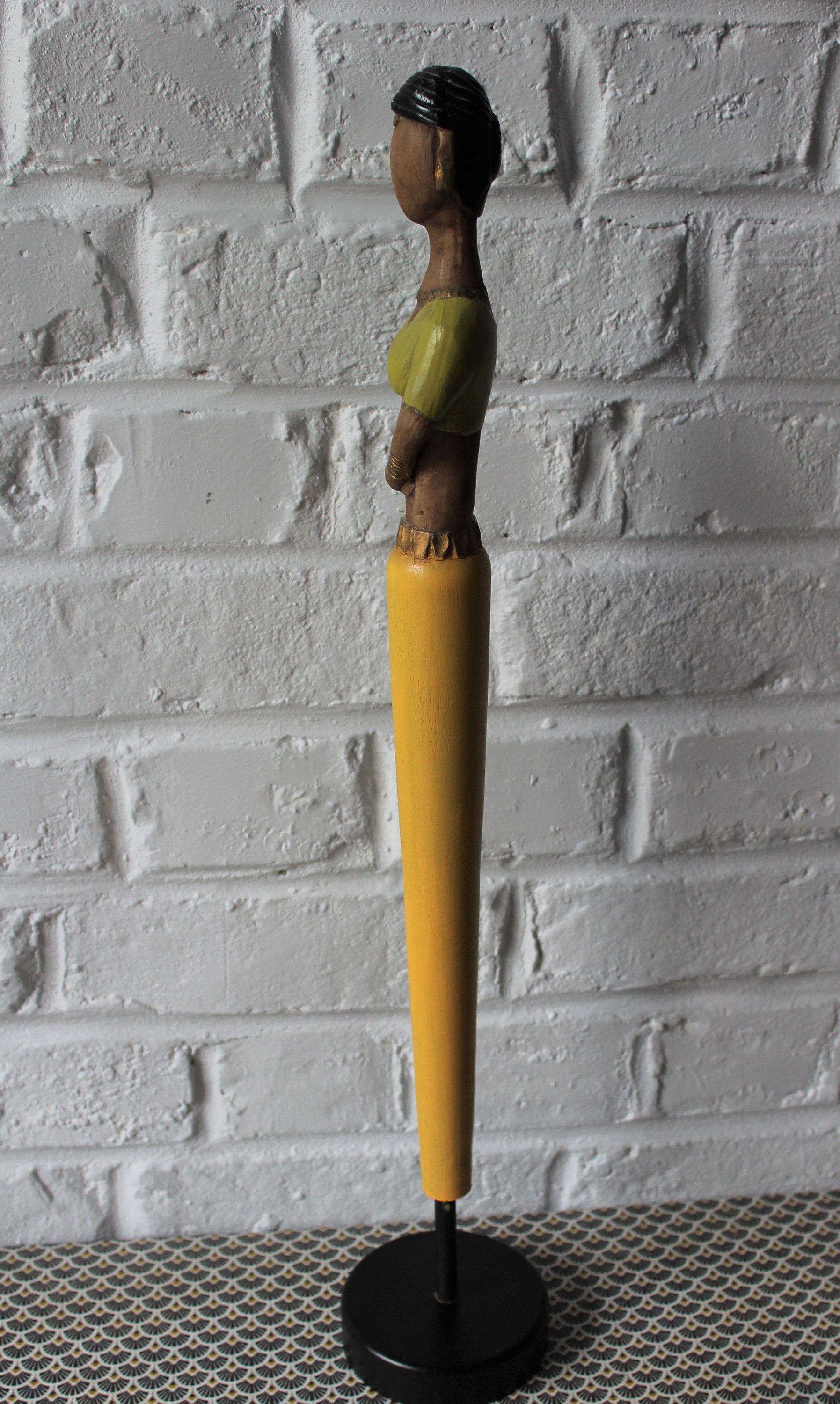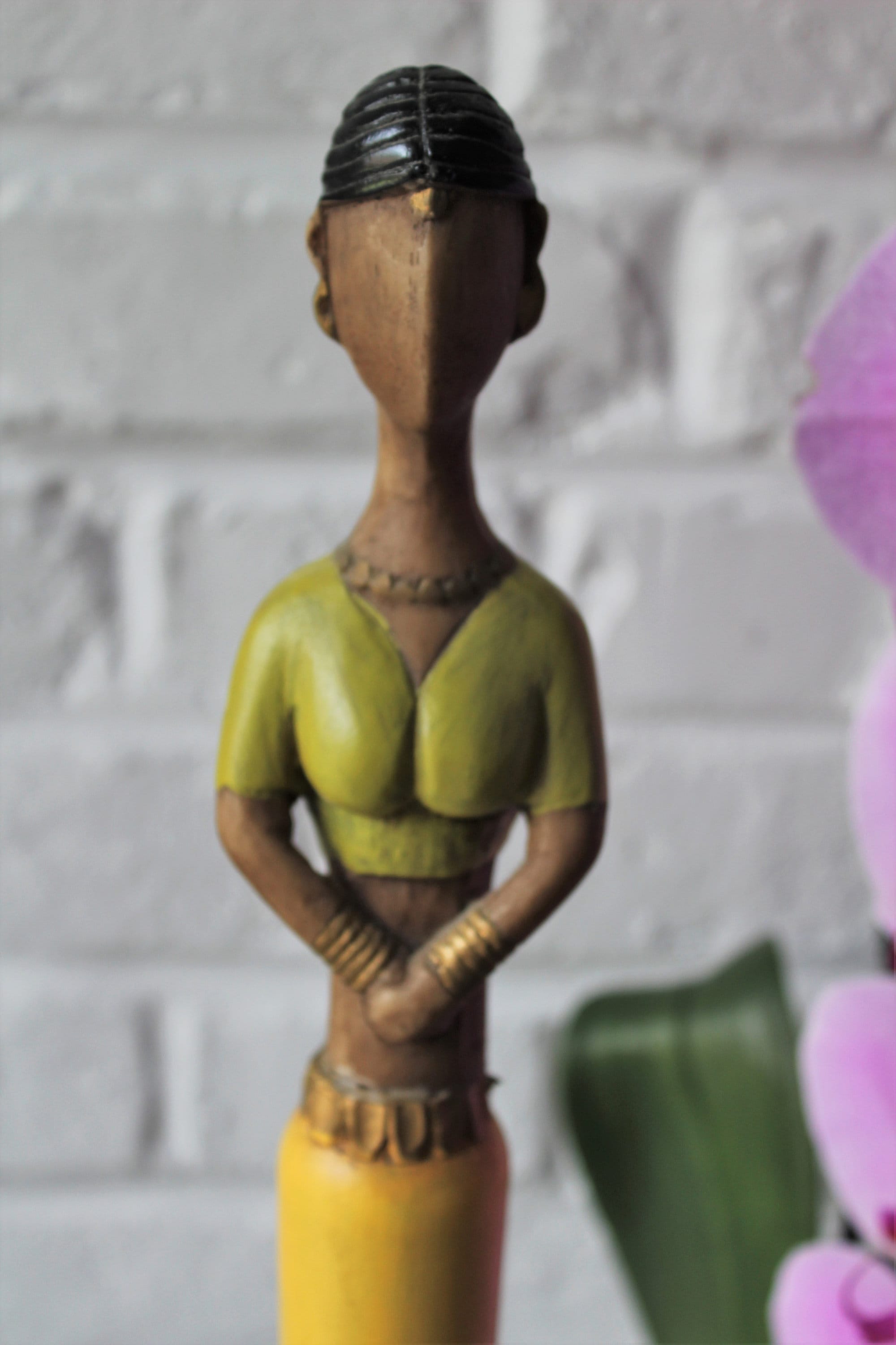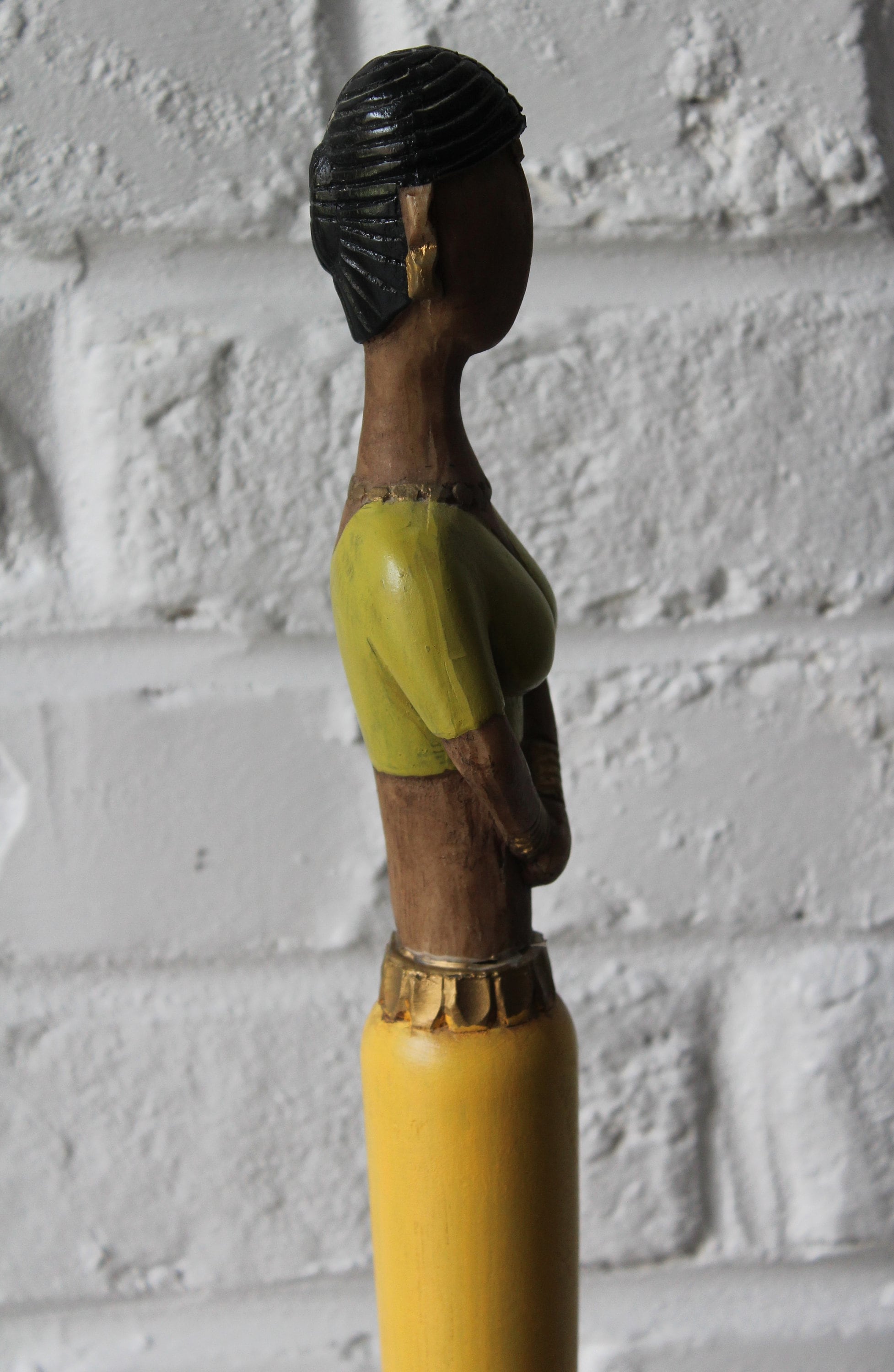 Made from lightweight wood, this figurine depicts a woman wearing a yellow, green and gold sari.