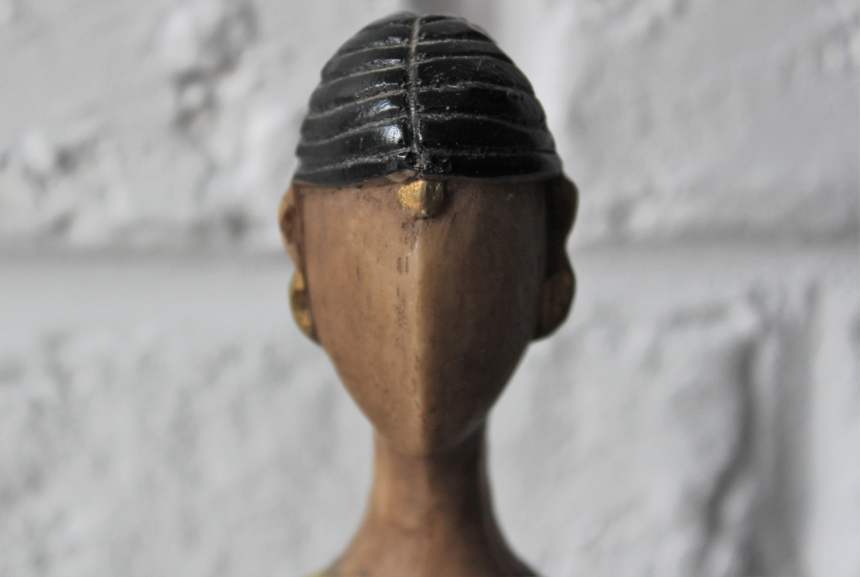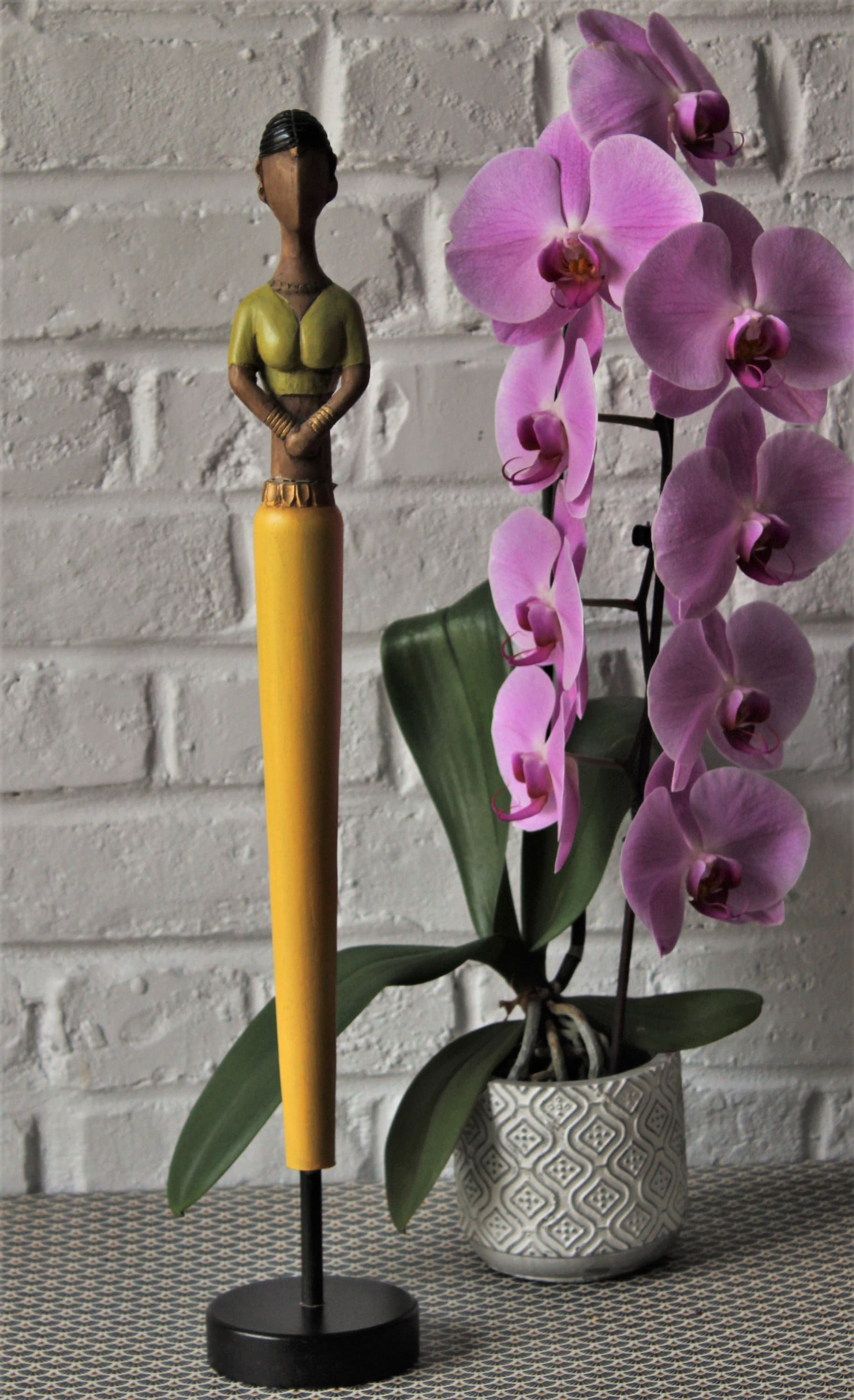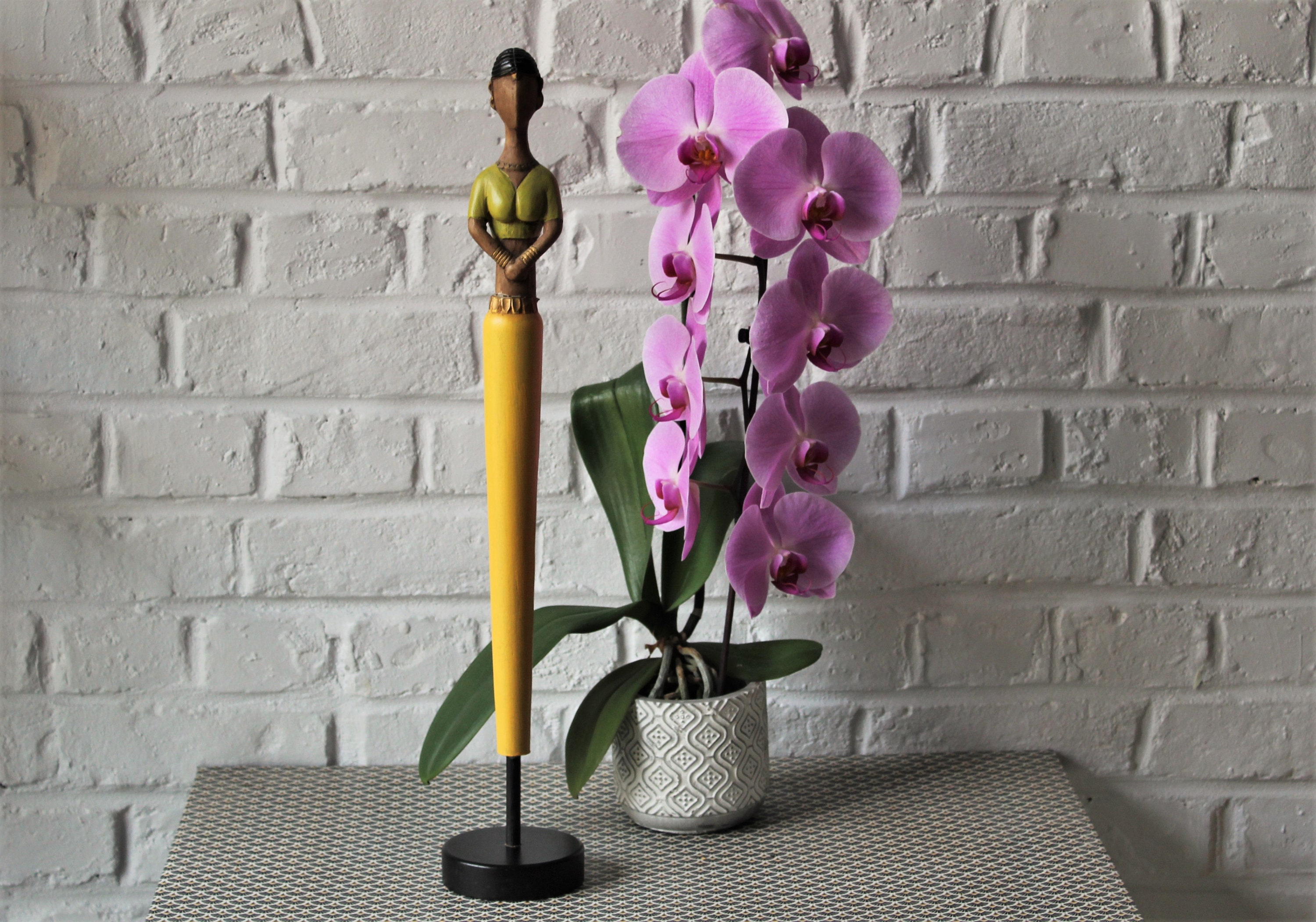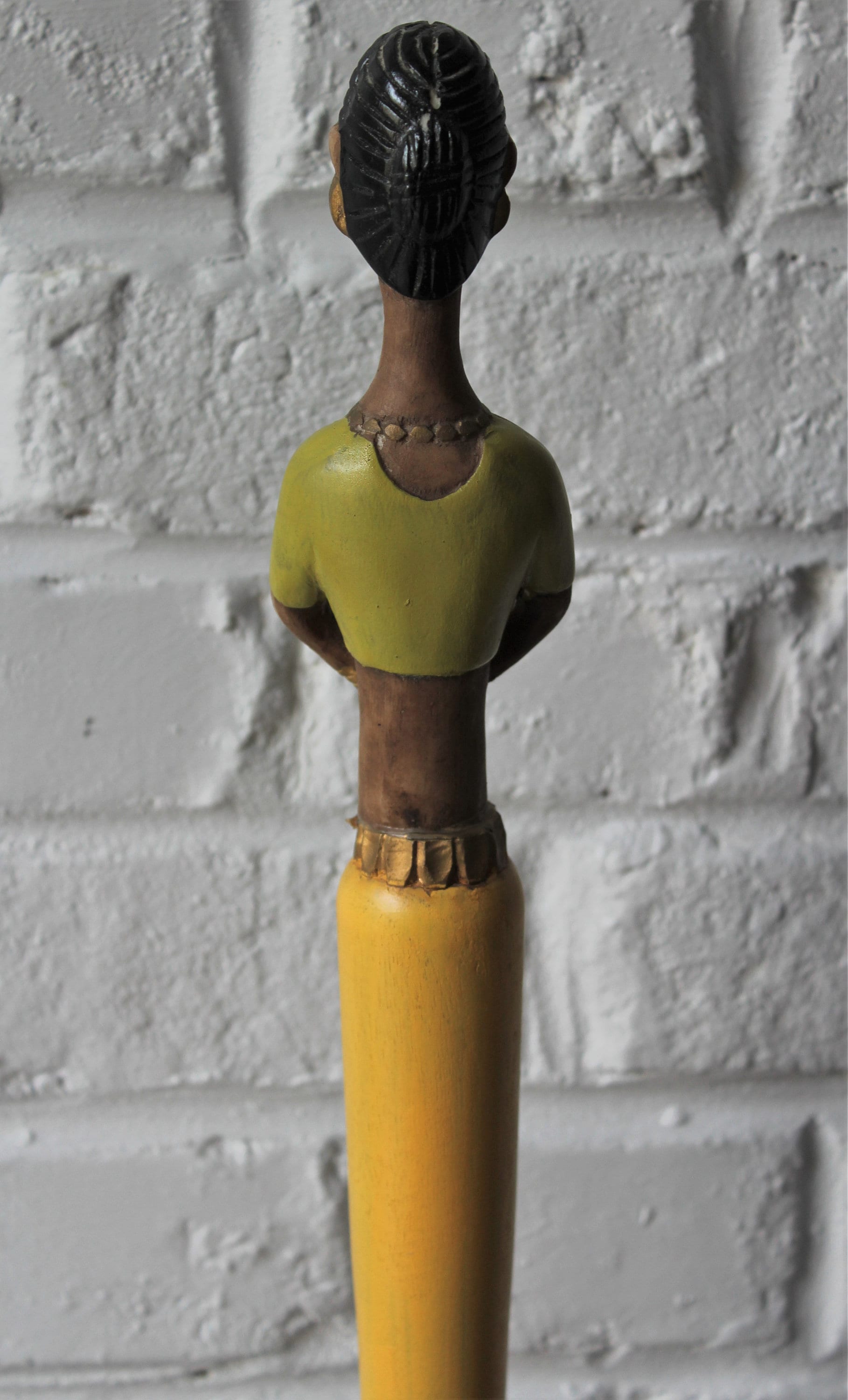 Made from lightweight wood, this figurine depicts a woman wearing a yellow, green and gold sari.