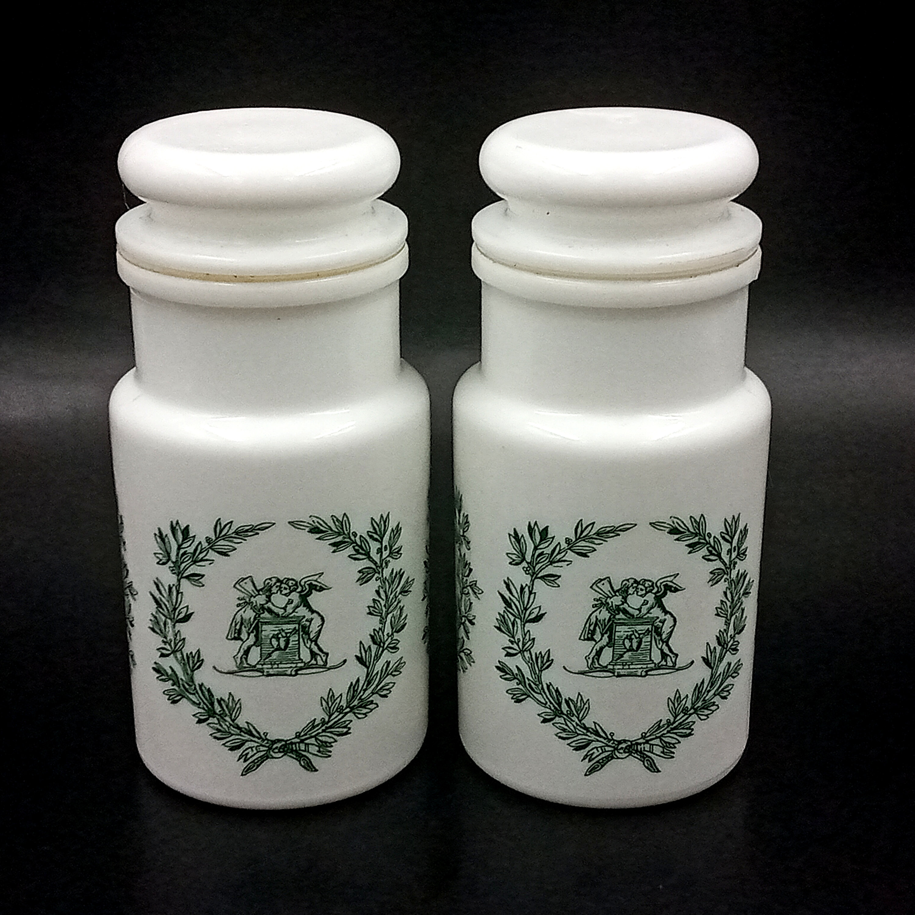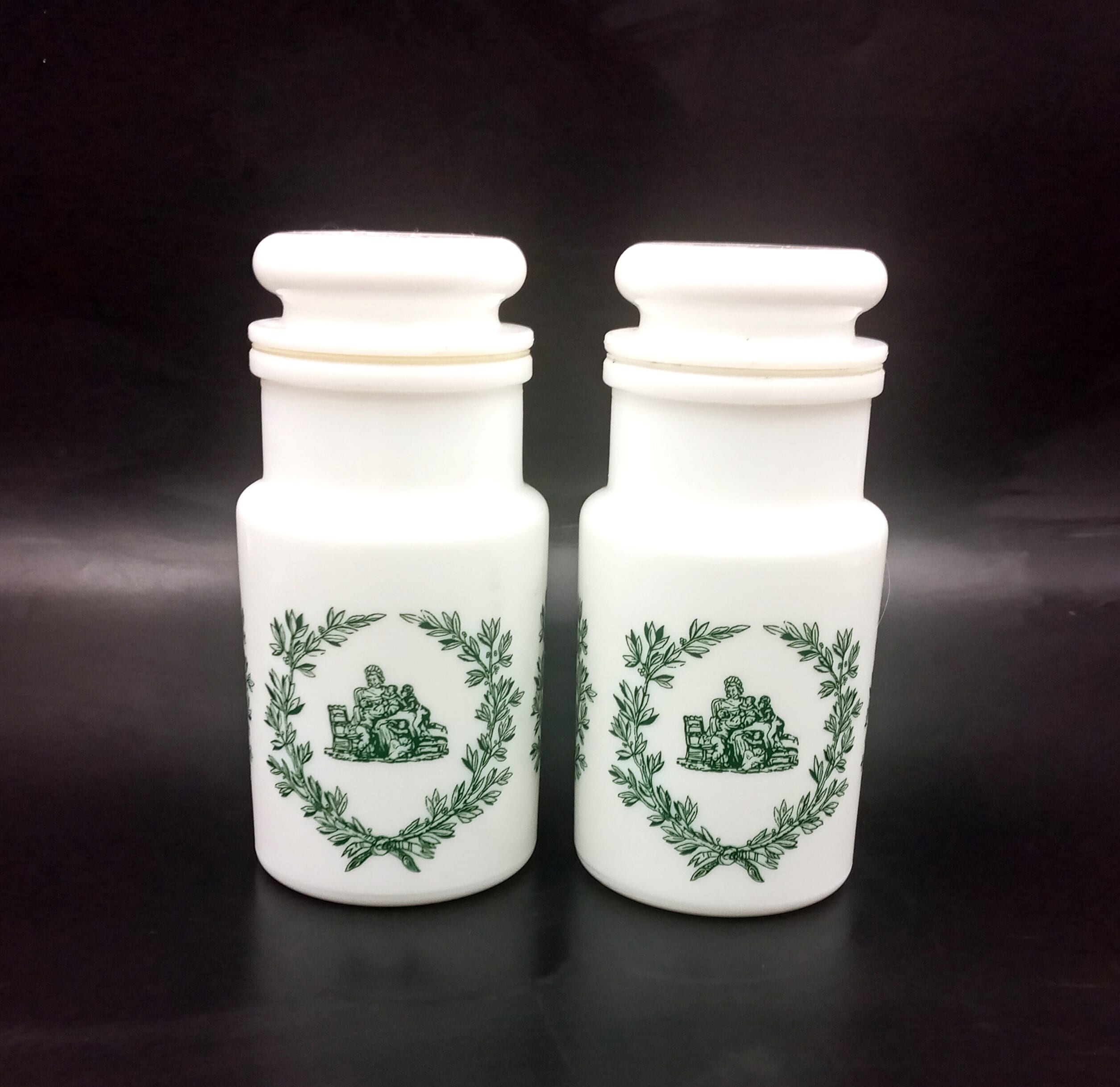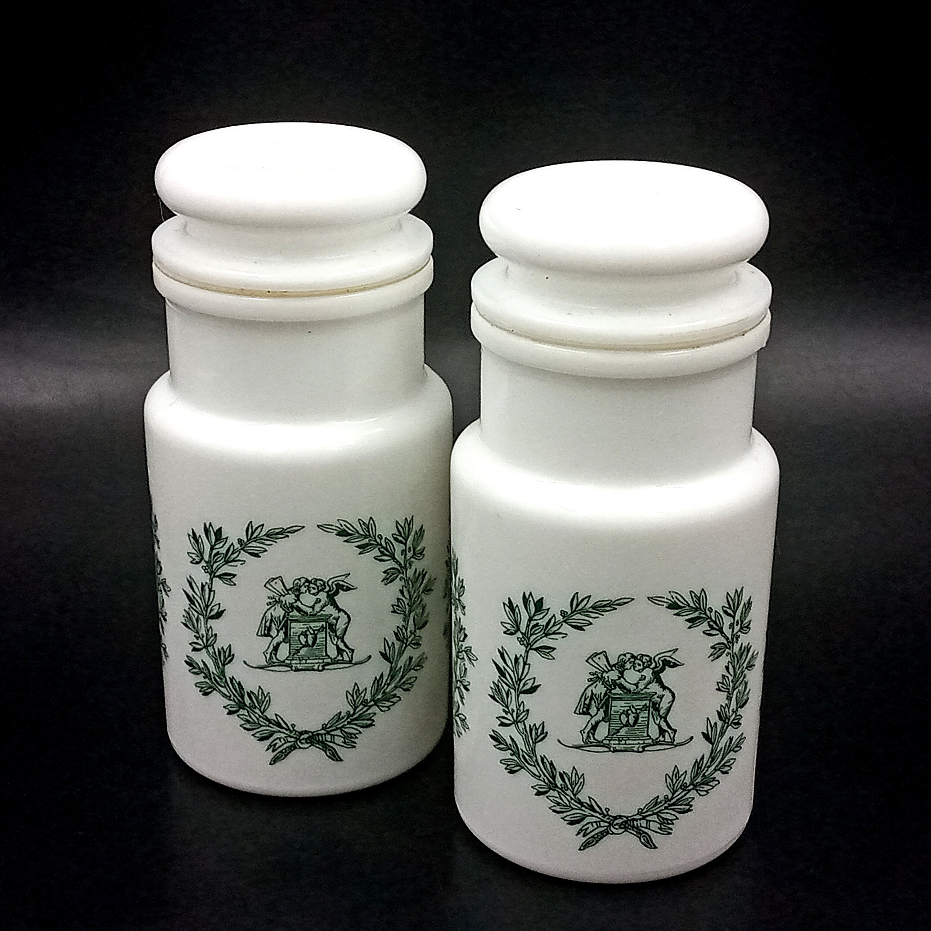 Two opaline pots made in Italy in the 1970s. Each pot has three identical green patterns printed around the rim.