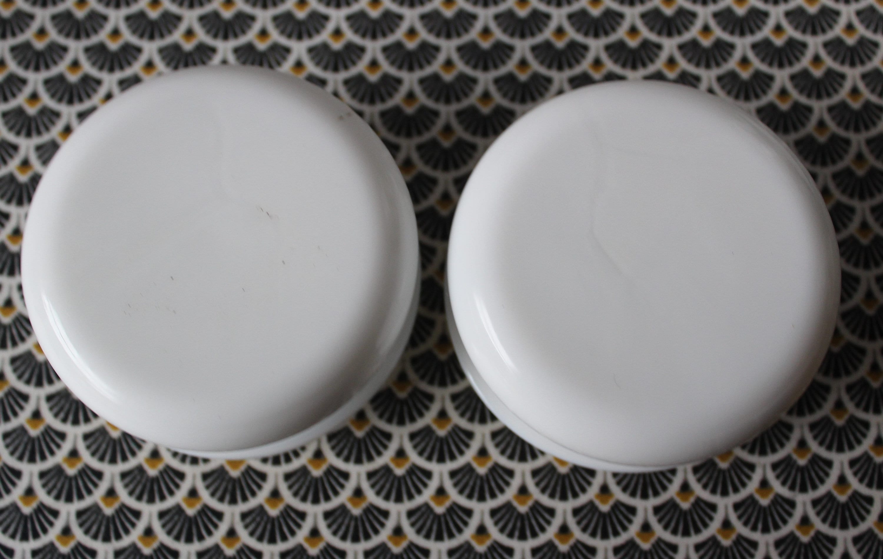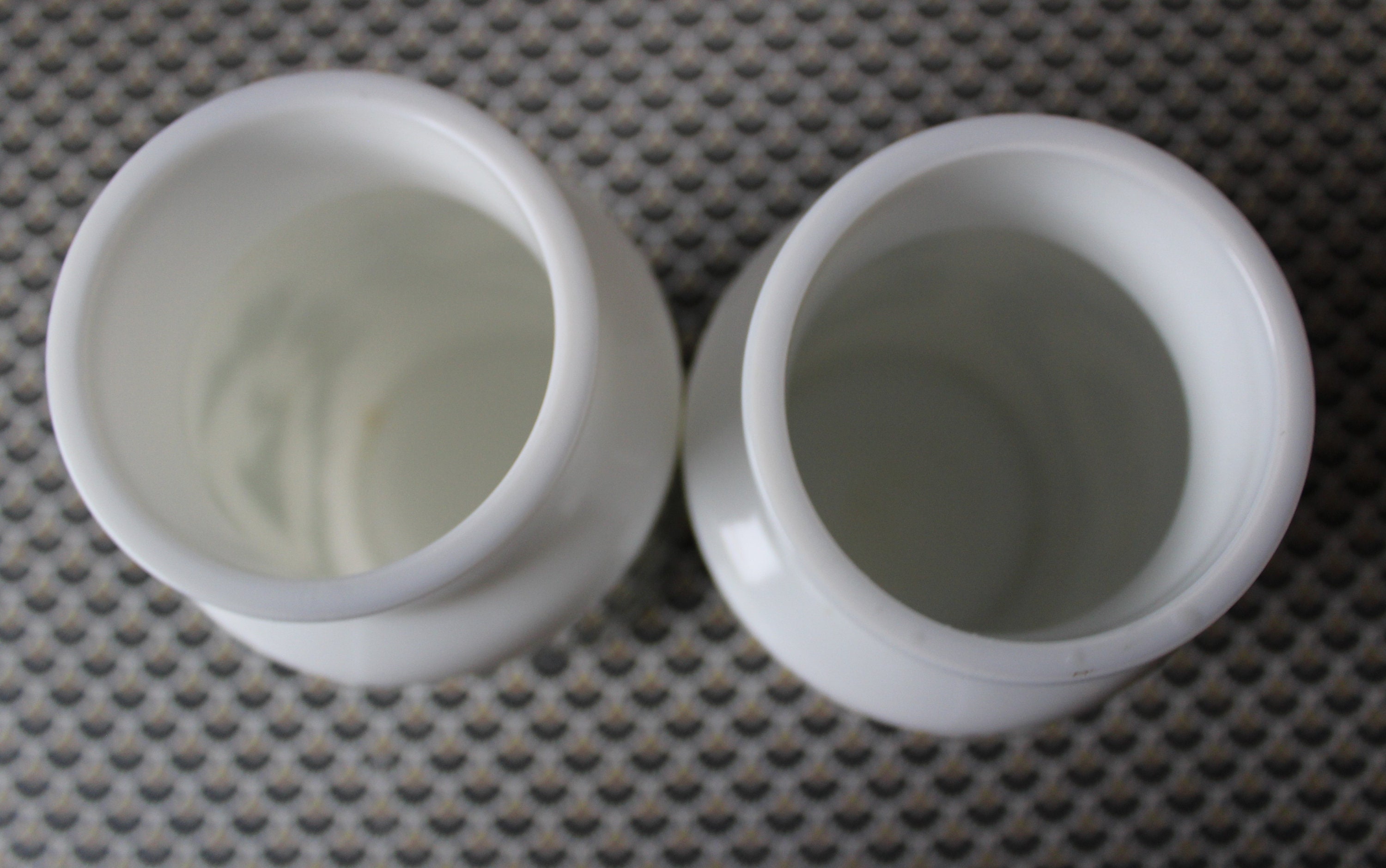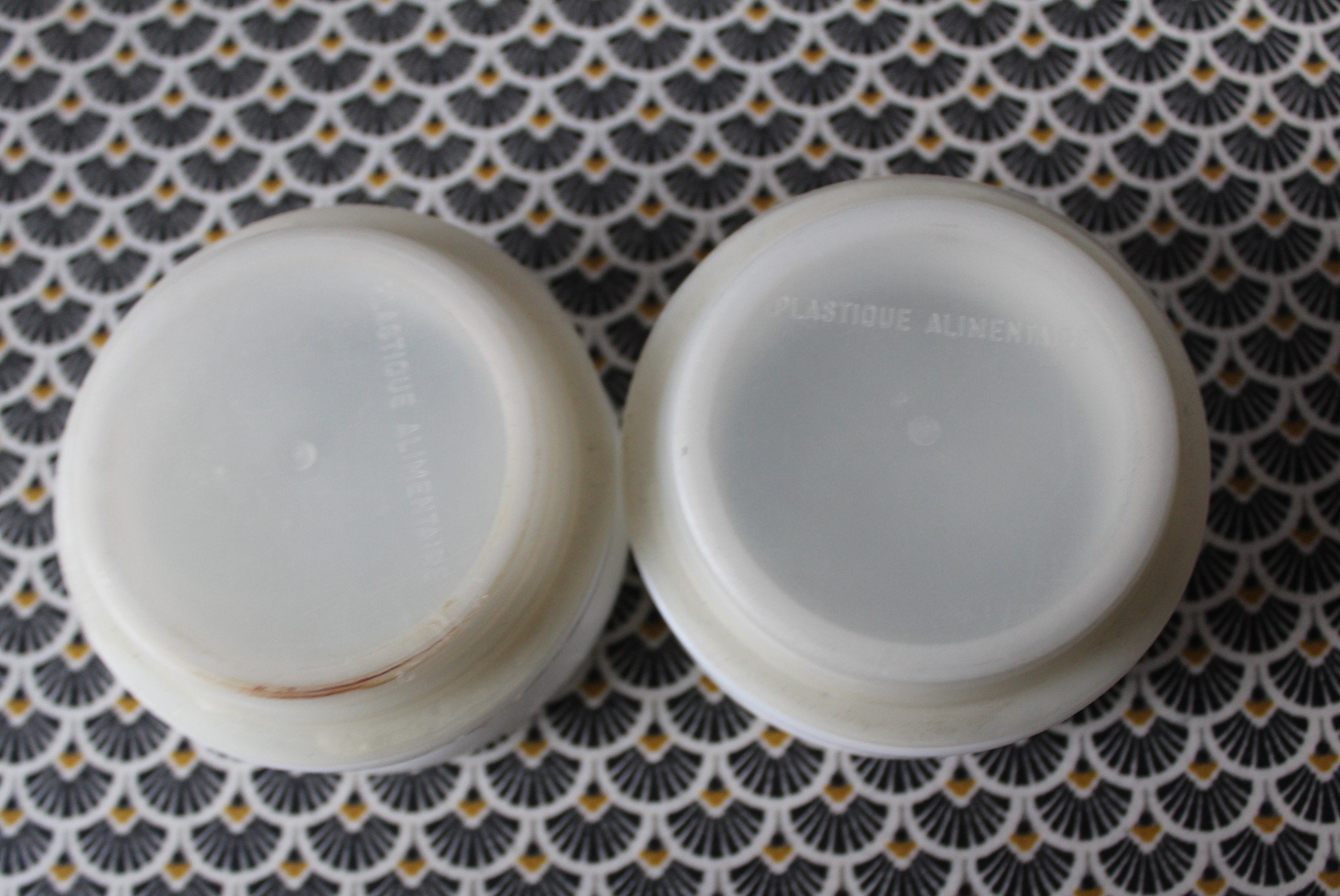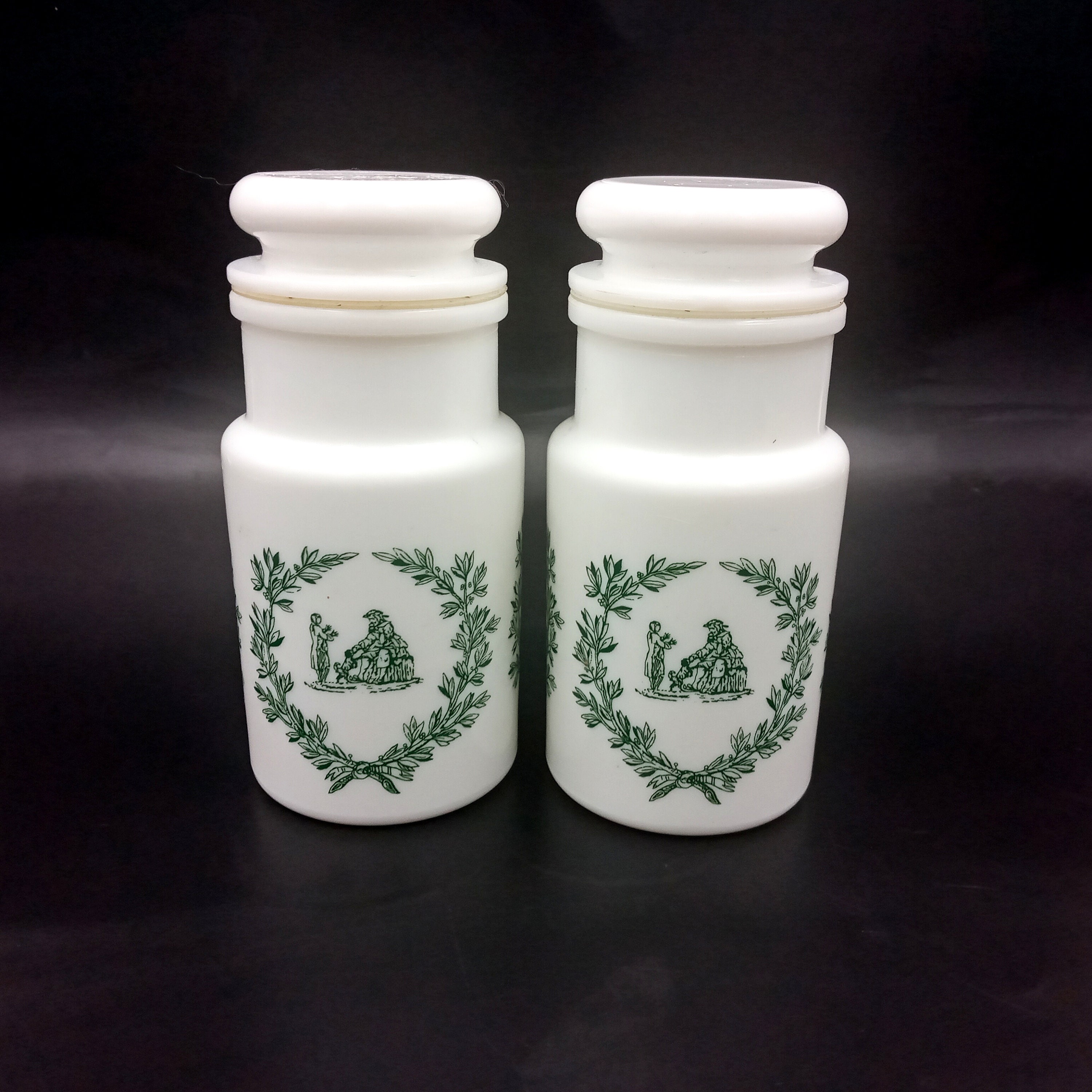 Two opaline pots made in Italy in the 1970s. Each pot has three identical green patterns printed around the rim.