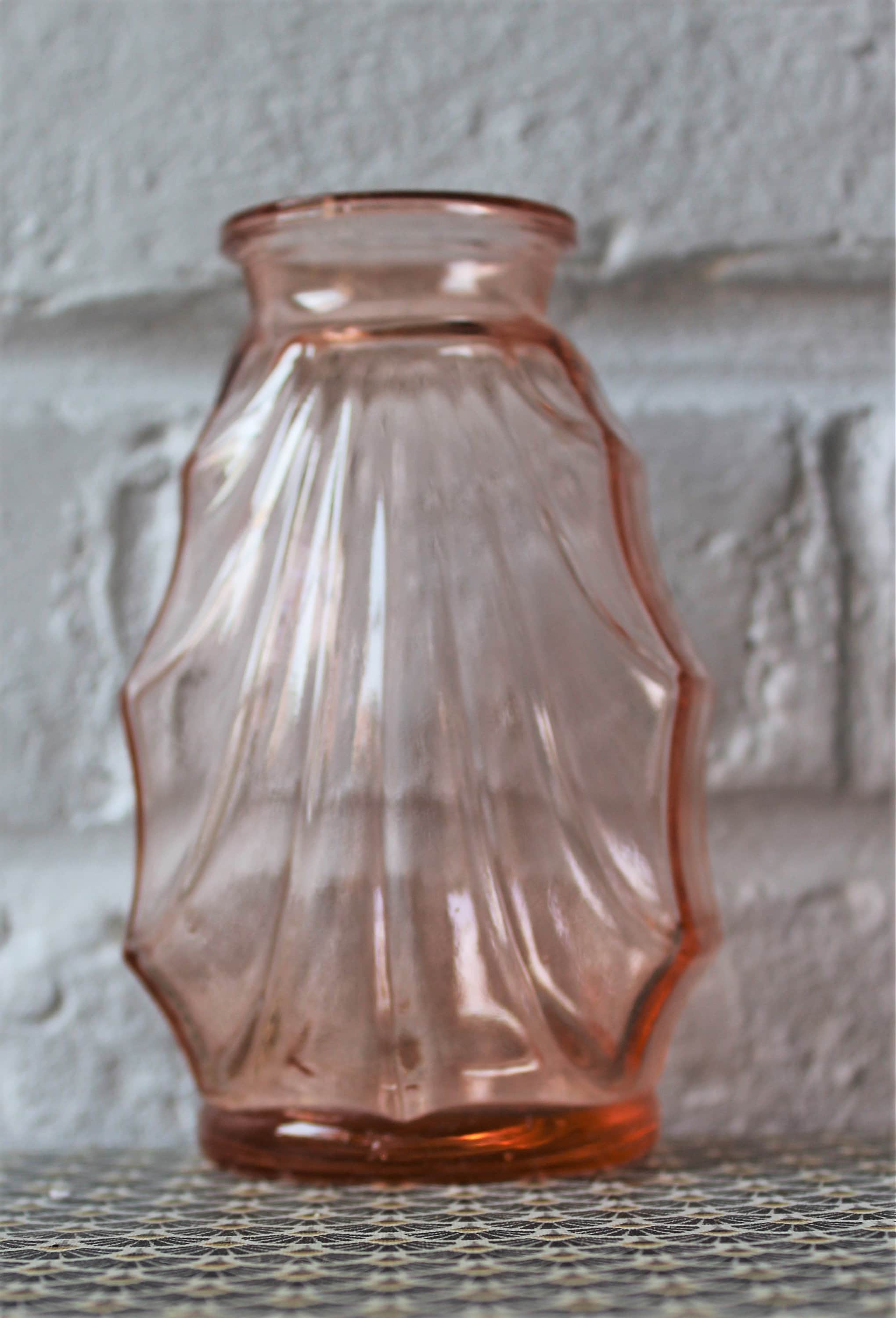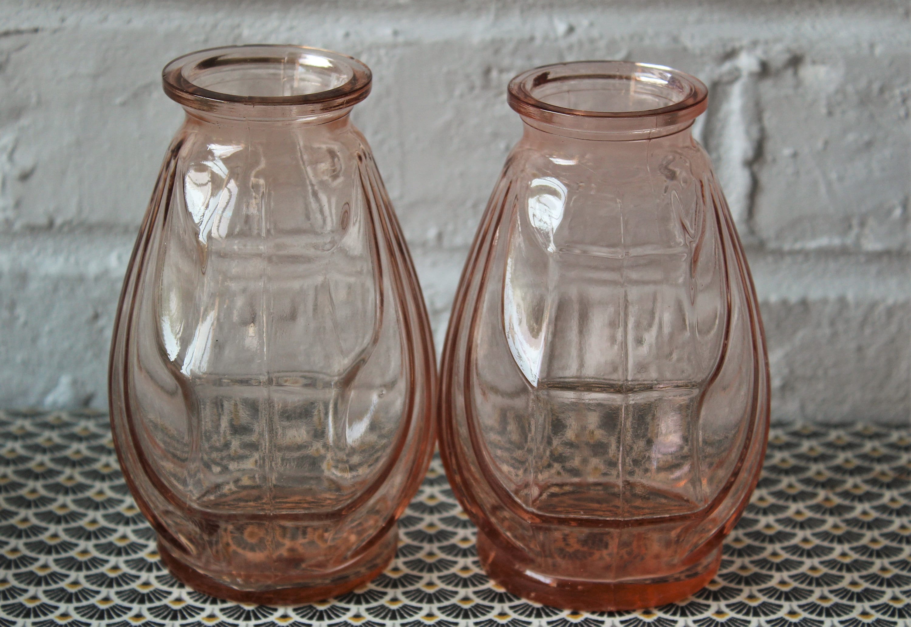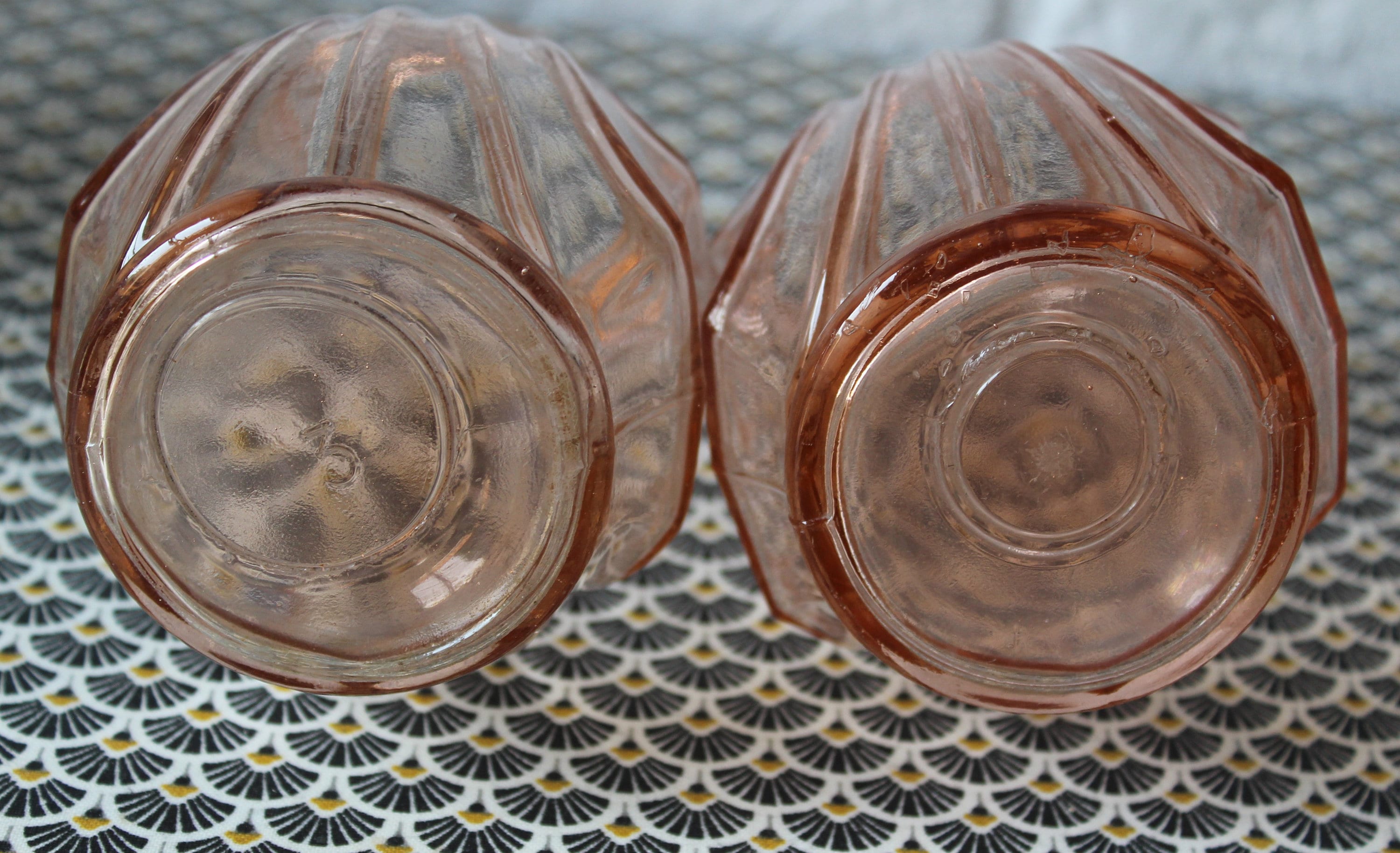 Deux vases en verre rose saumon de petite taille, parfaits pour de petits bouquets.
