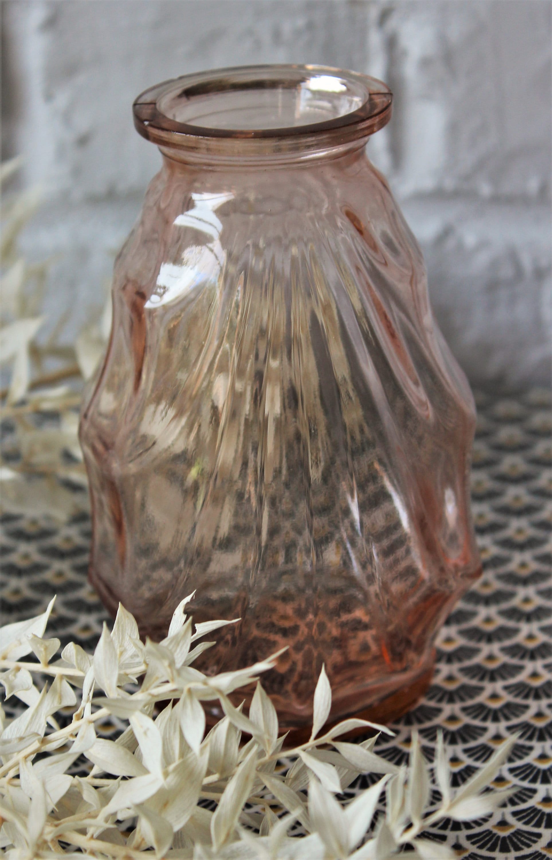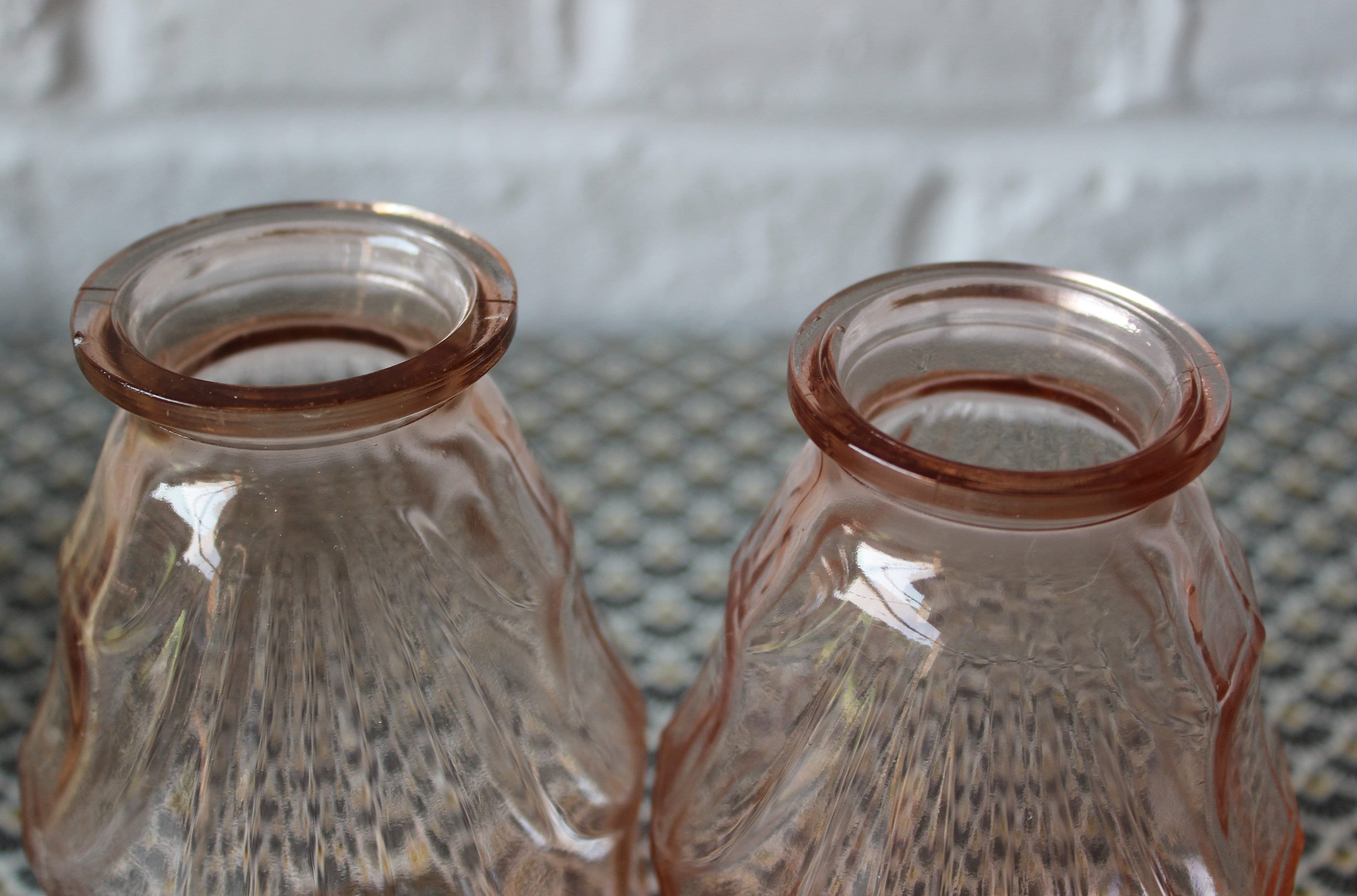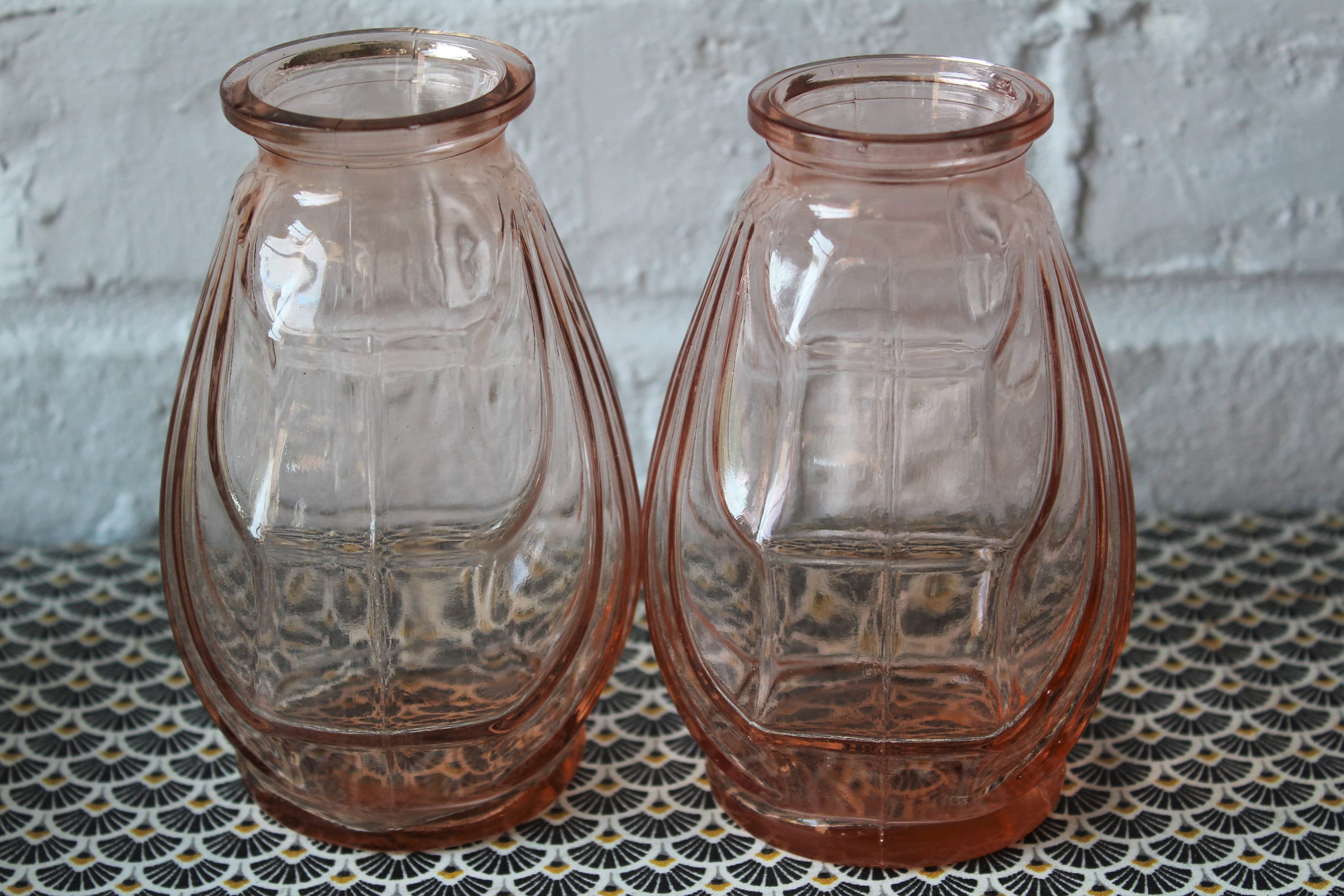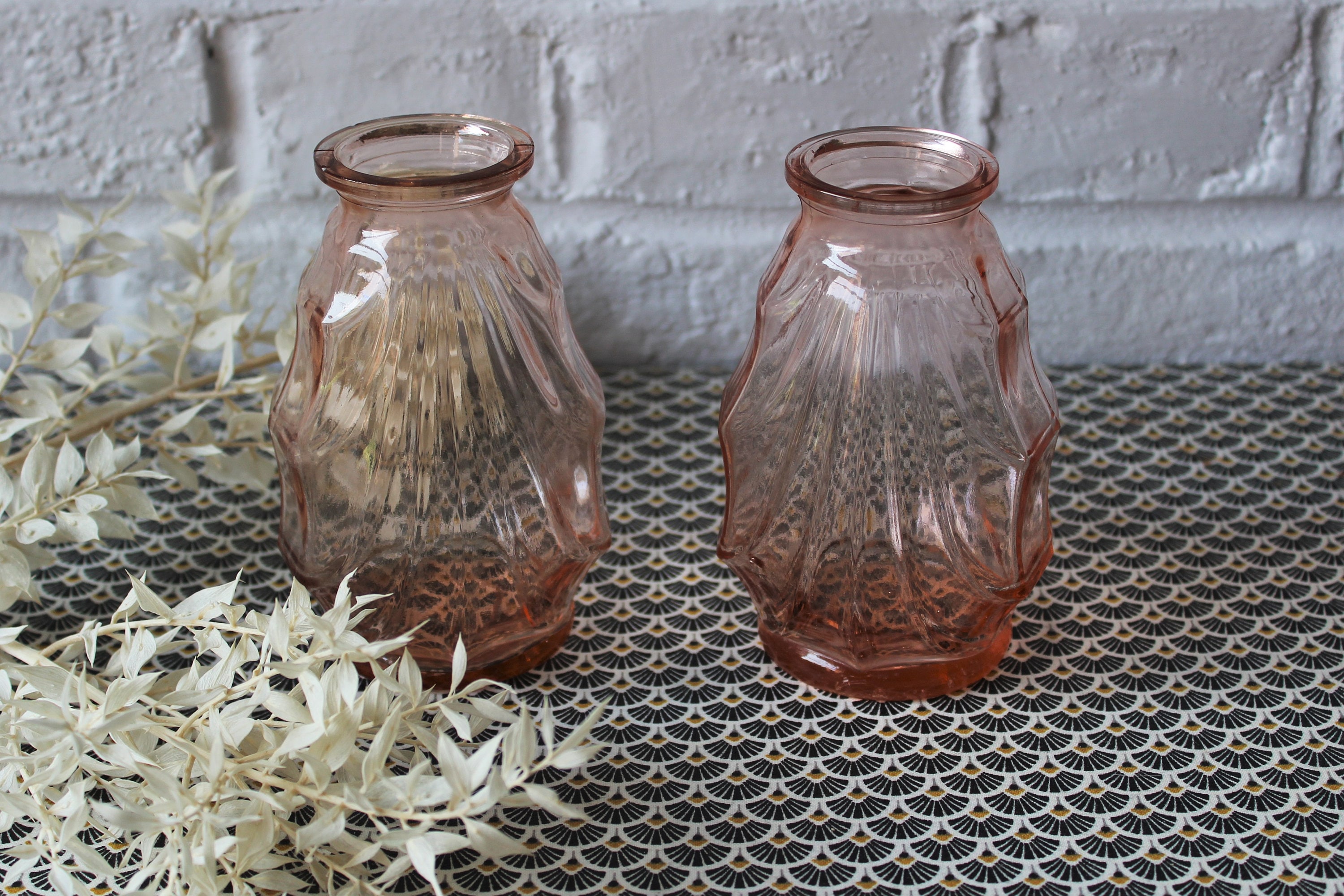Deux vases en verre rose saumon de petite taille, parfaits pour de petits bouquets.