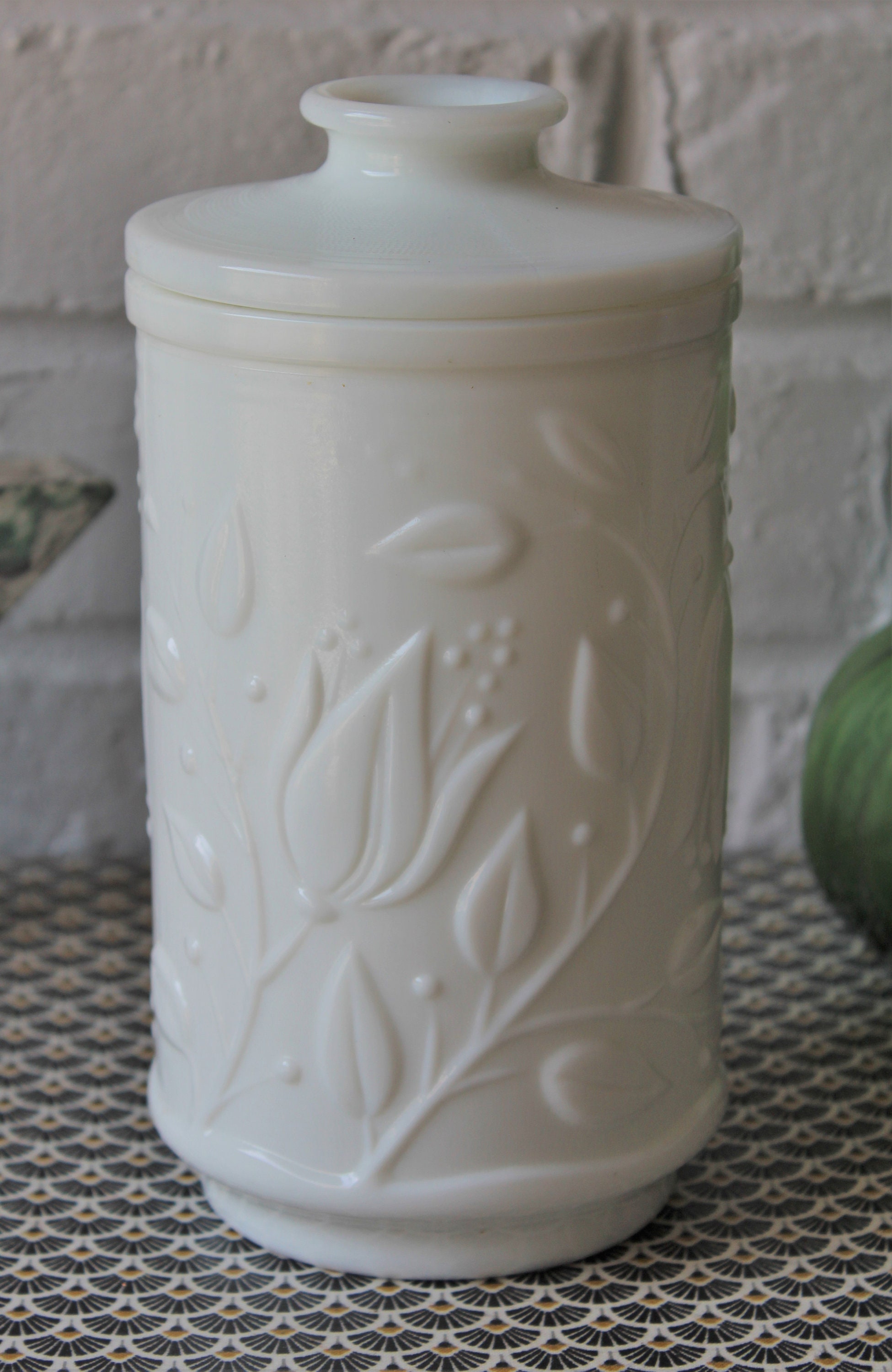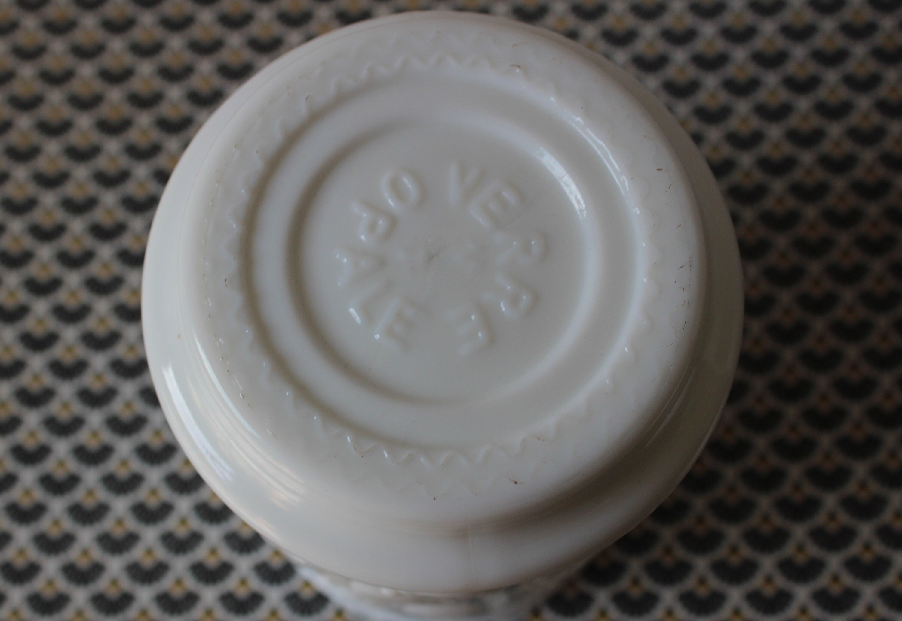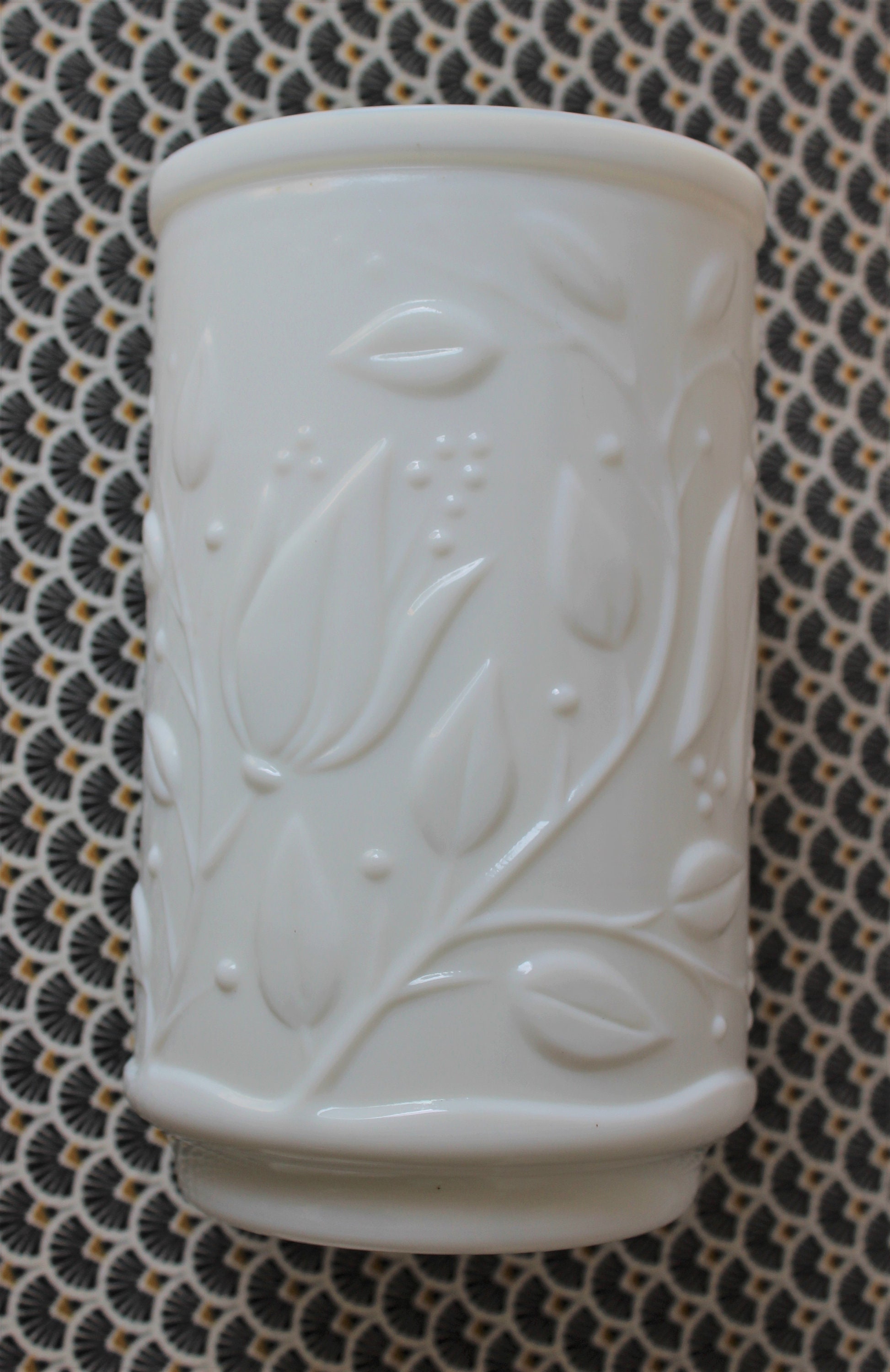 White opaline pot, 70s. Covered with patterns of flowers and leaves in relief.