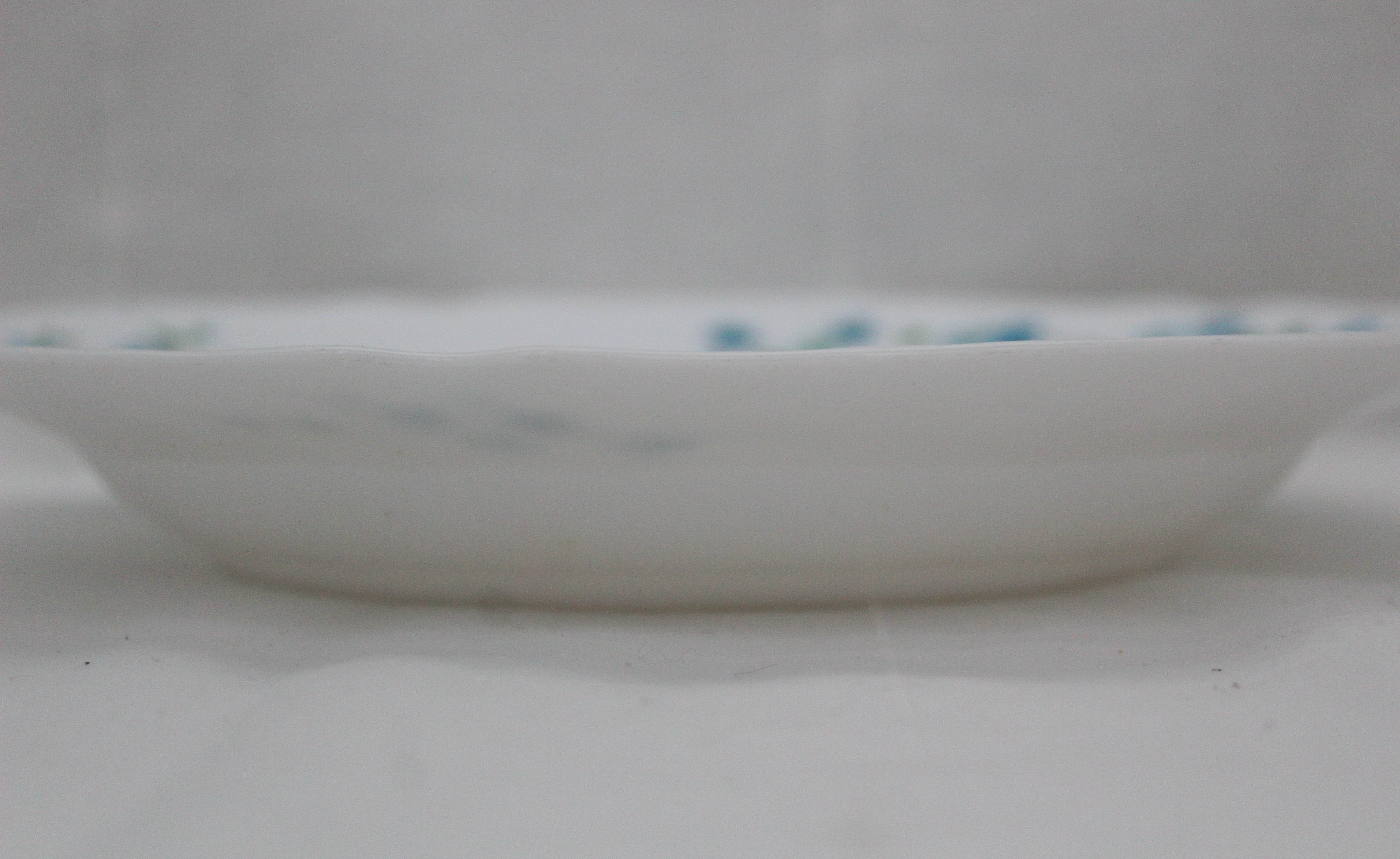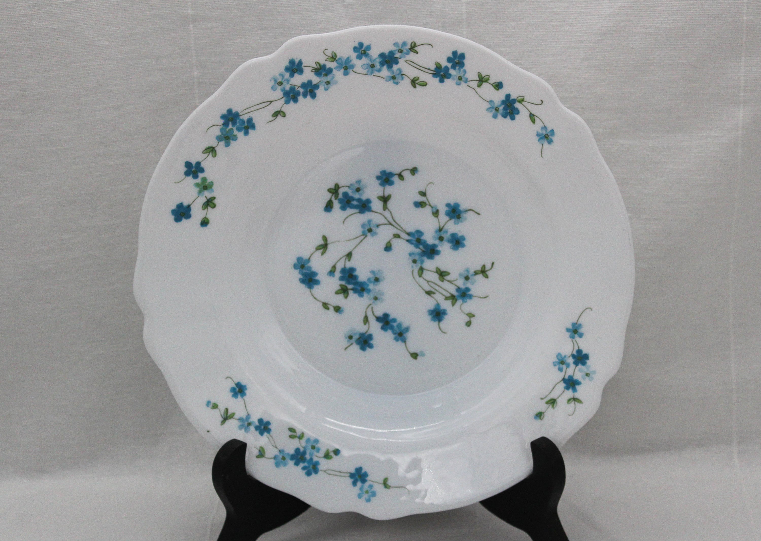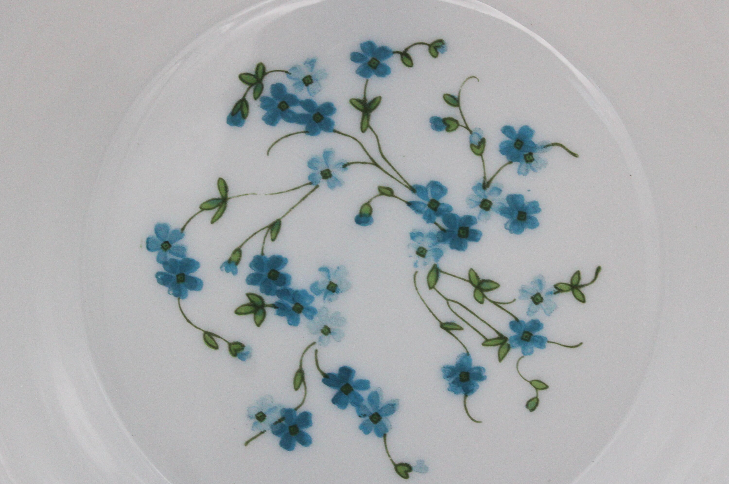 They combine with the white of the glass, a pattern of forget-me-not flowers in different shades of blue.