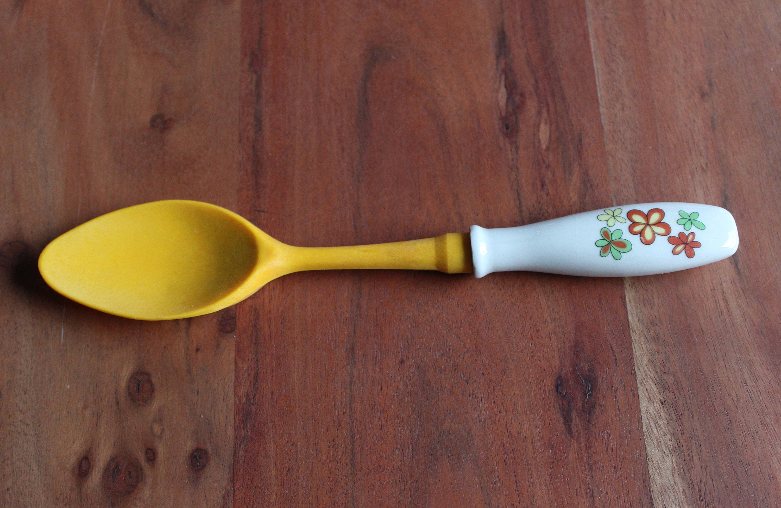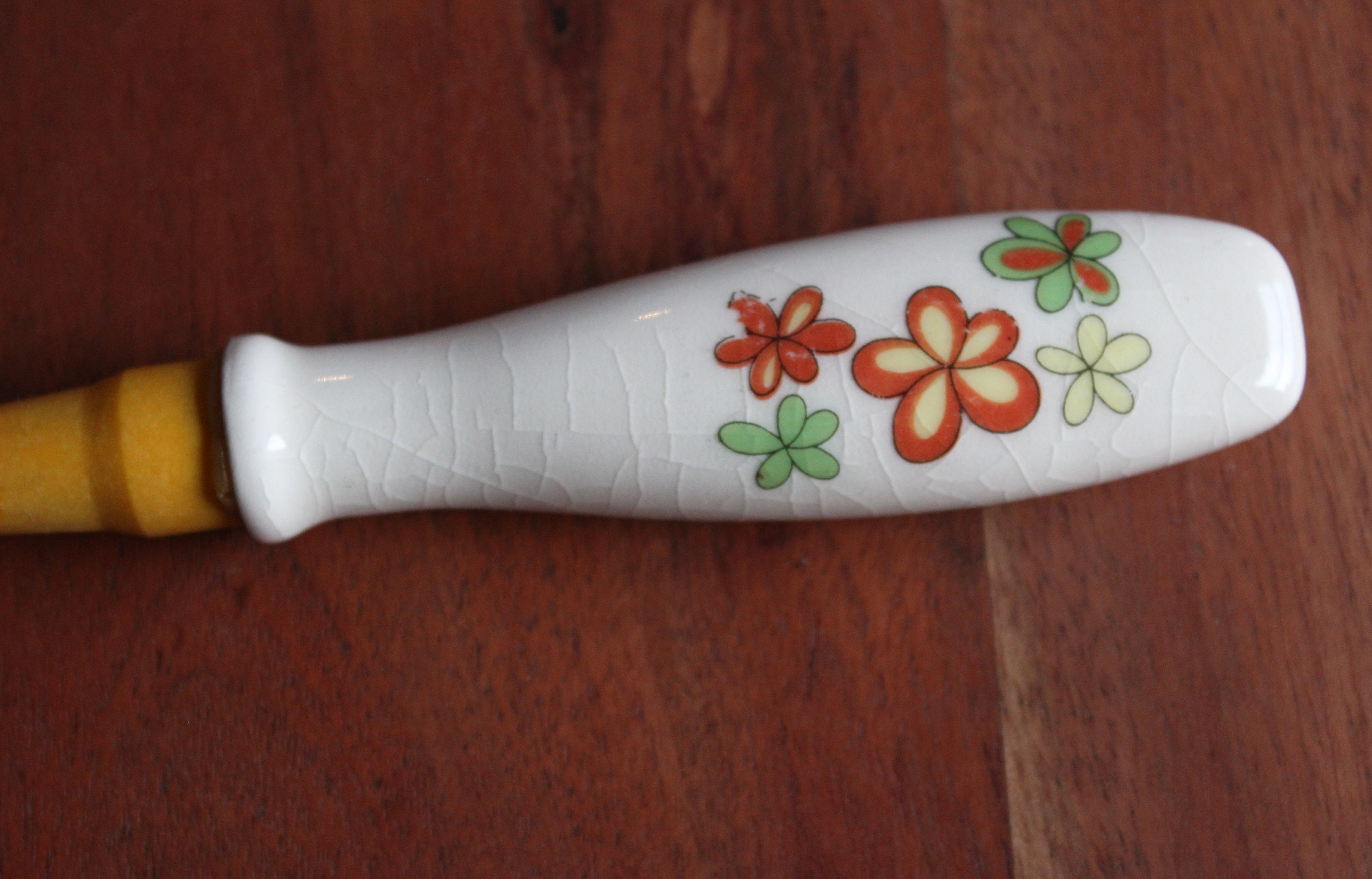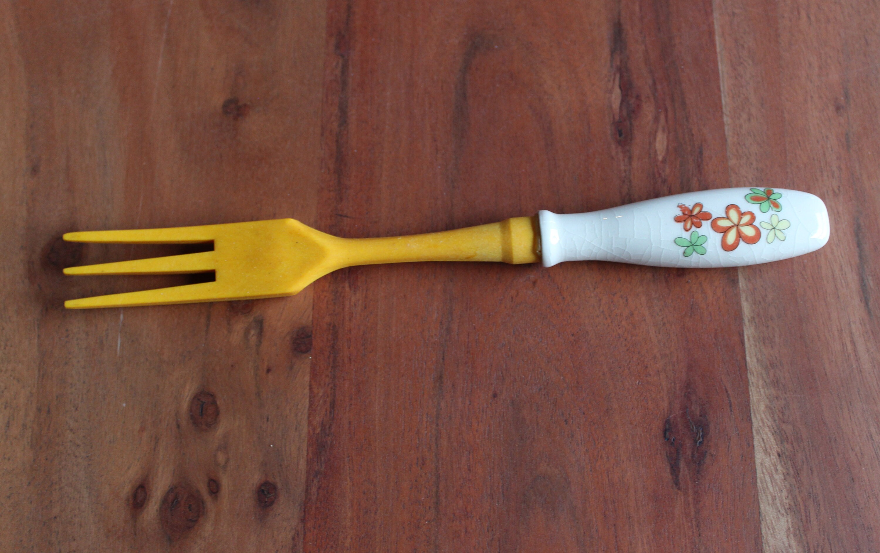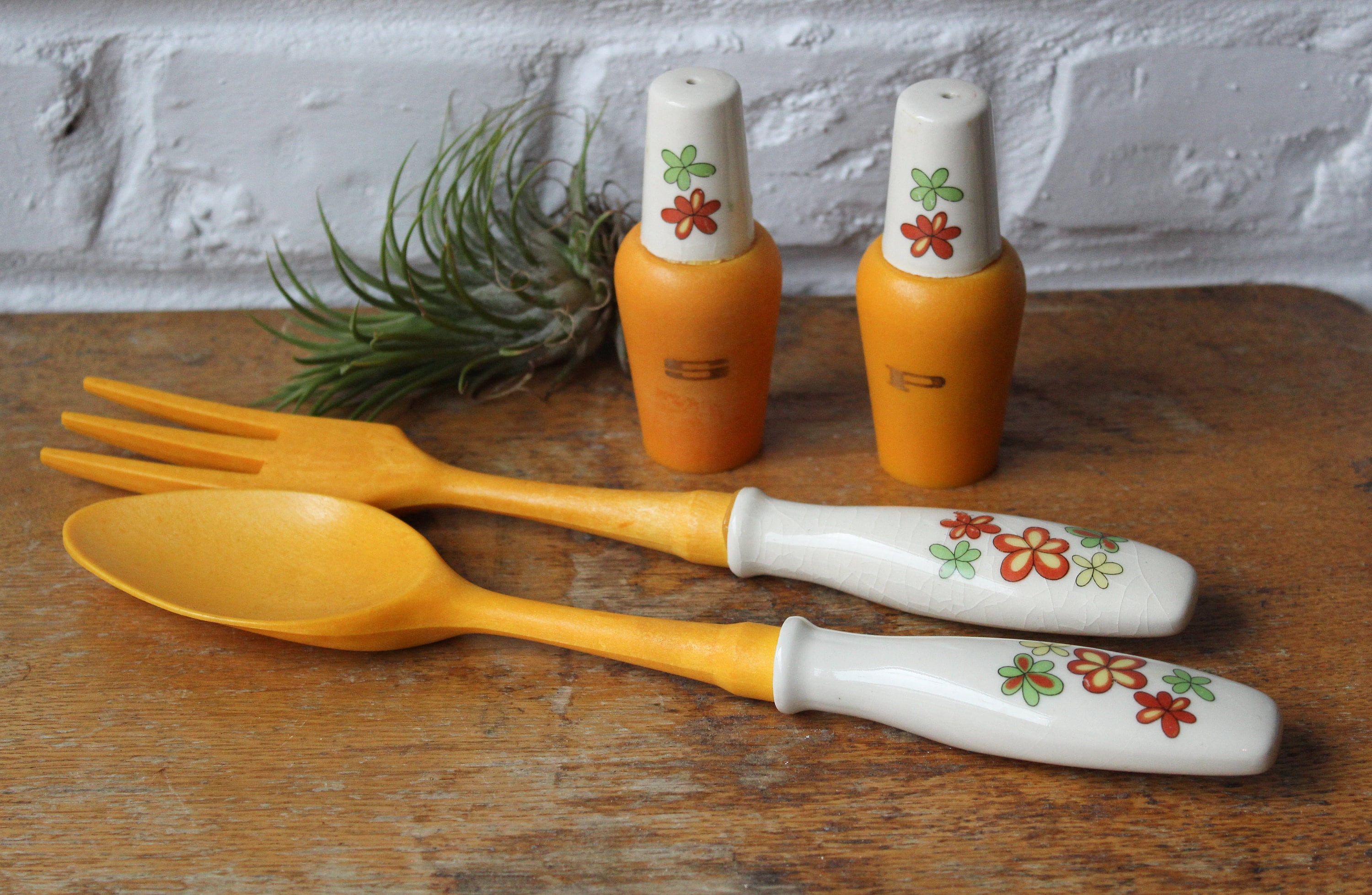 Set consisting of salad servers in hard plastic (bakelite style) with ceramic handles, salt and pepper shakers in the same materials.