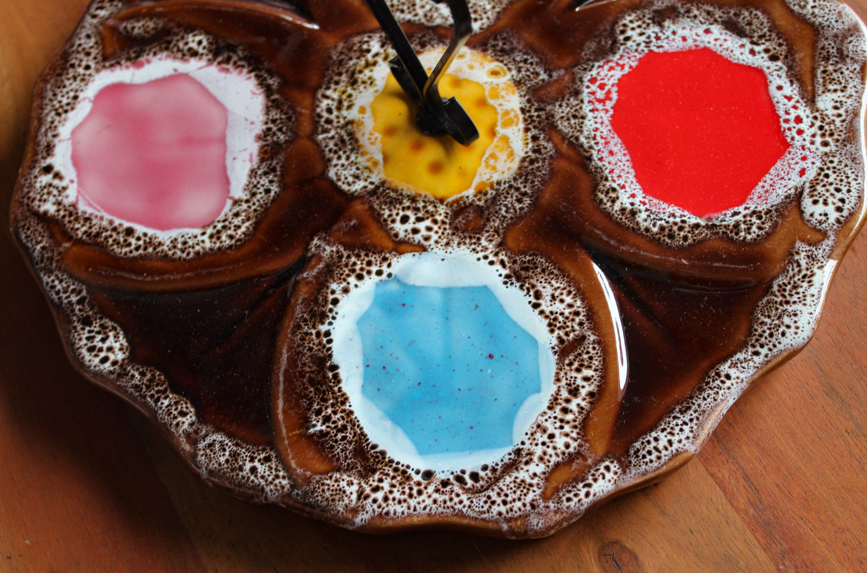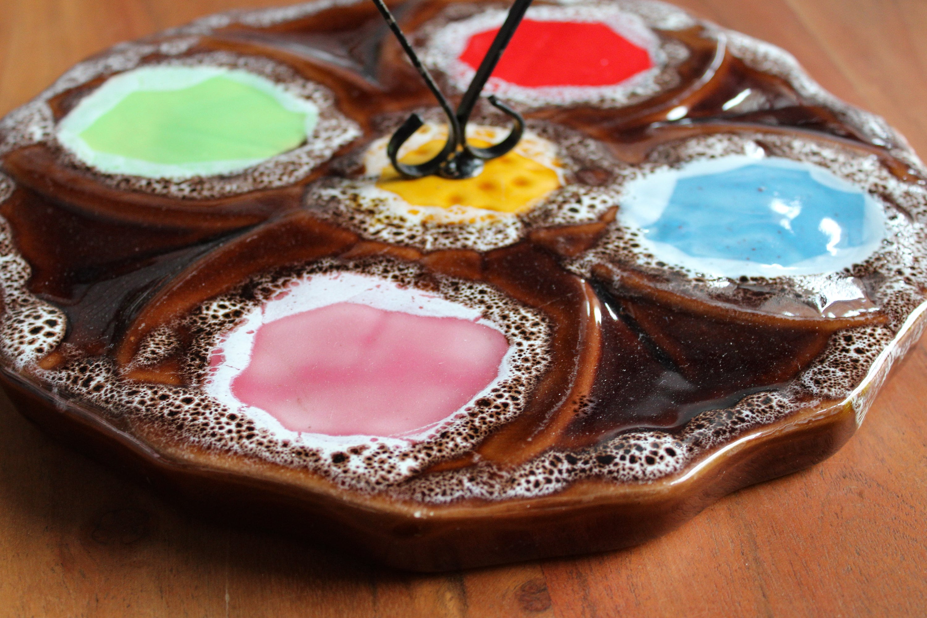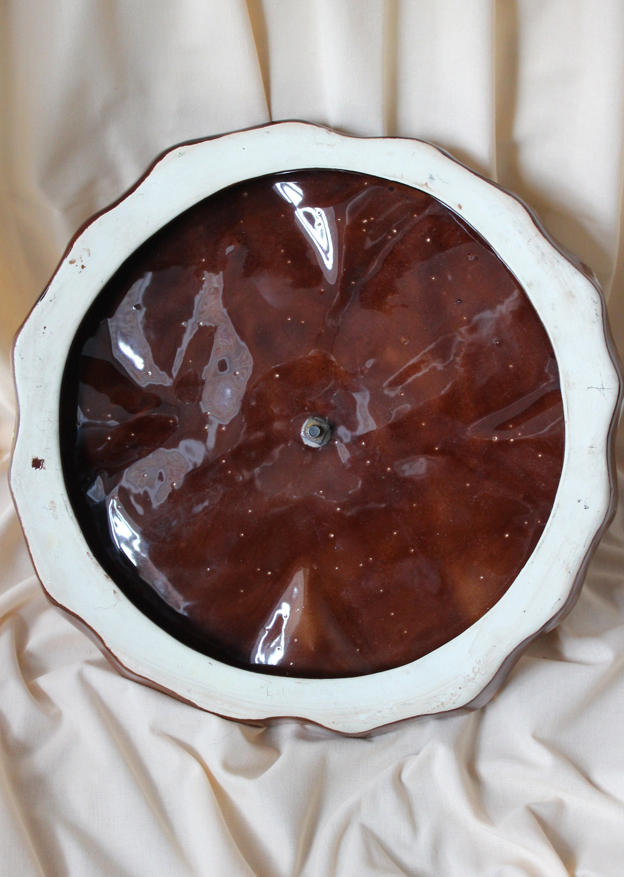 Typical of the 1960s, this small, round-shaped Valauris-style tray is an original mix of textures and colors with circles of different colors encircled in cloudy white on a glossy dark brown glazed background.