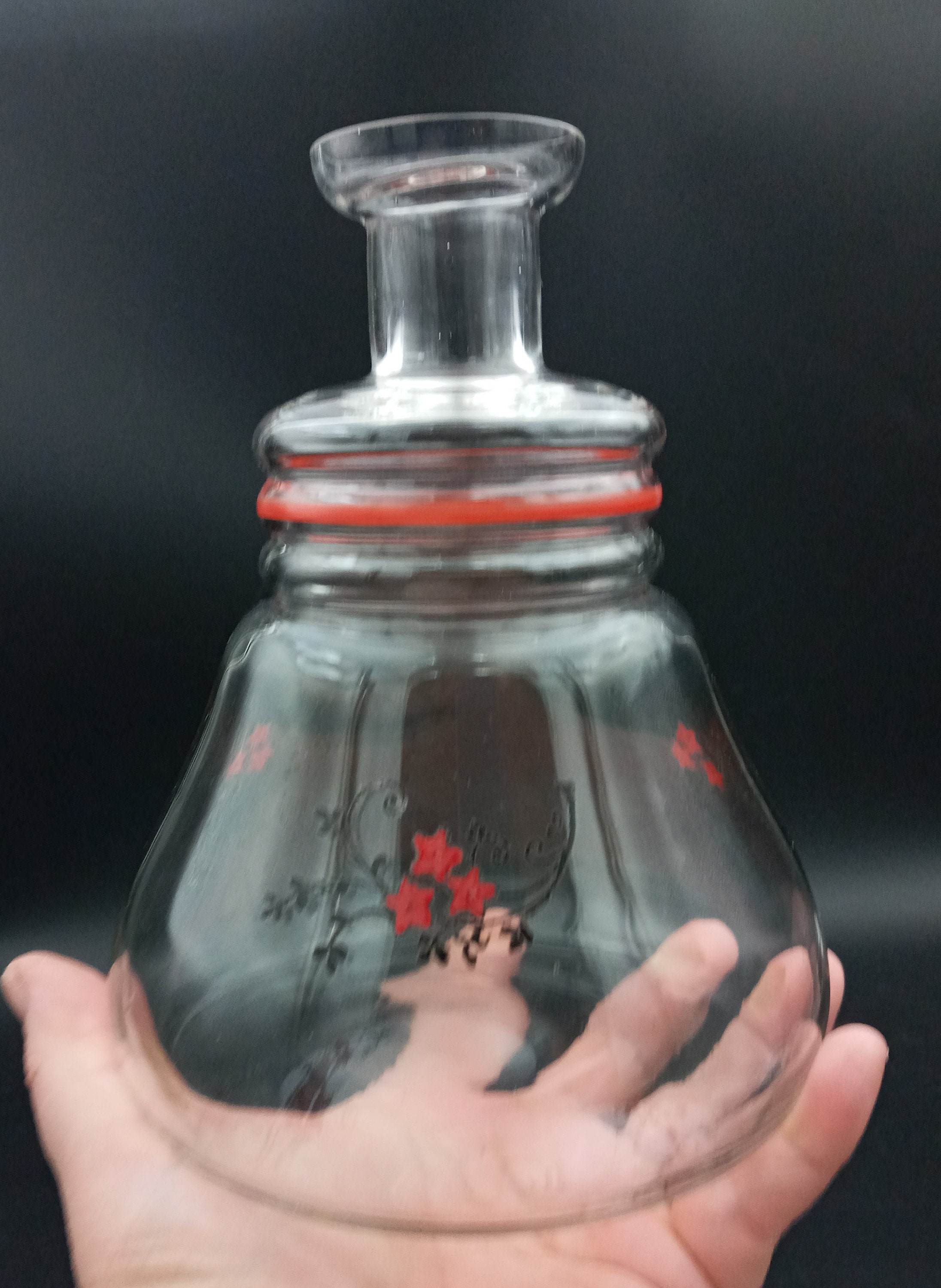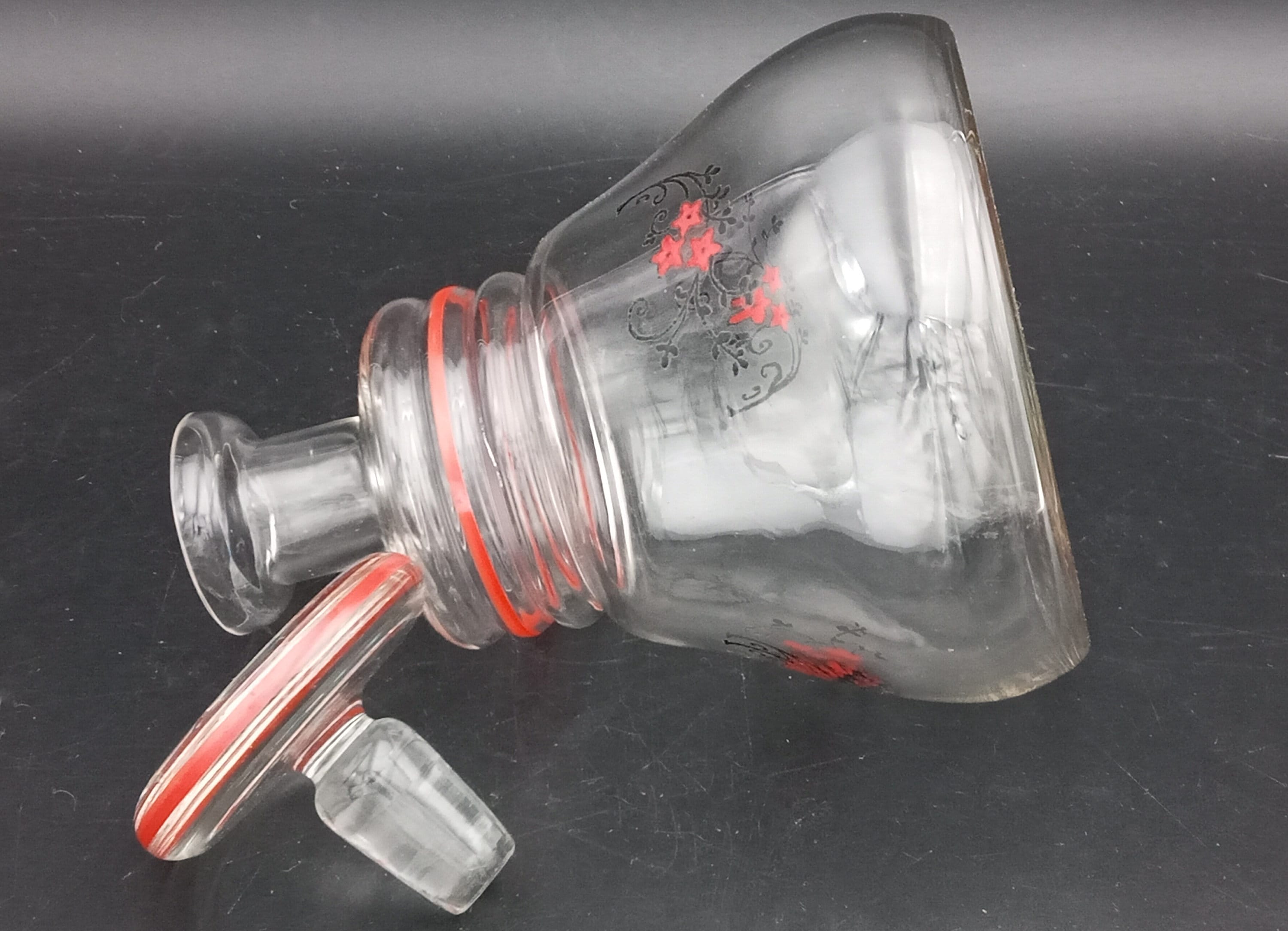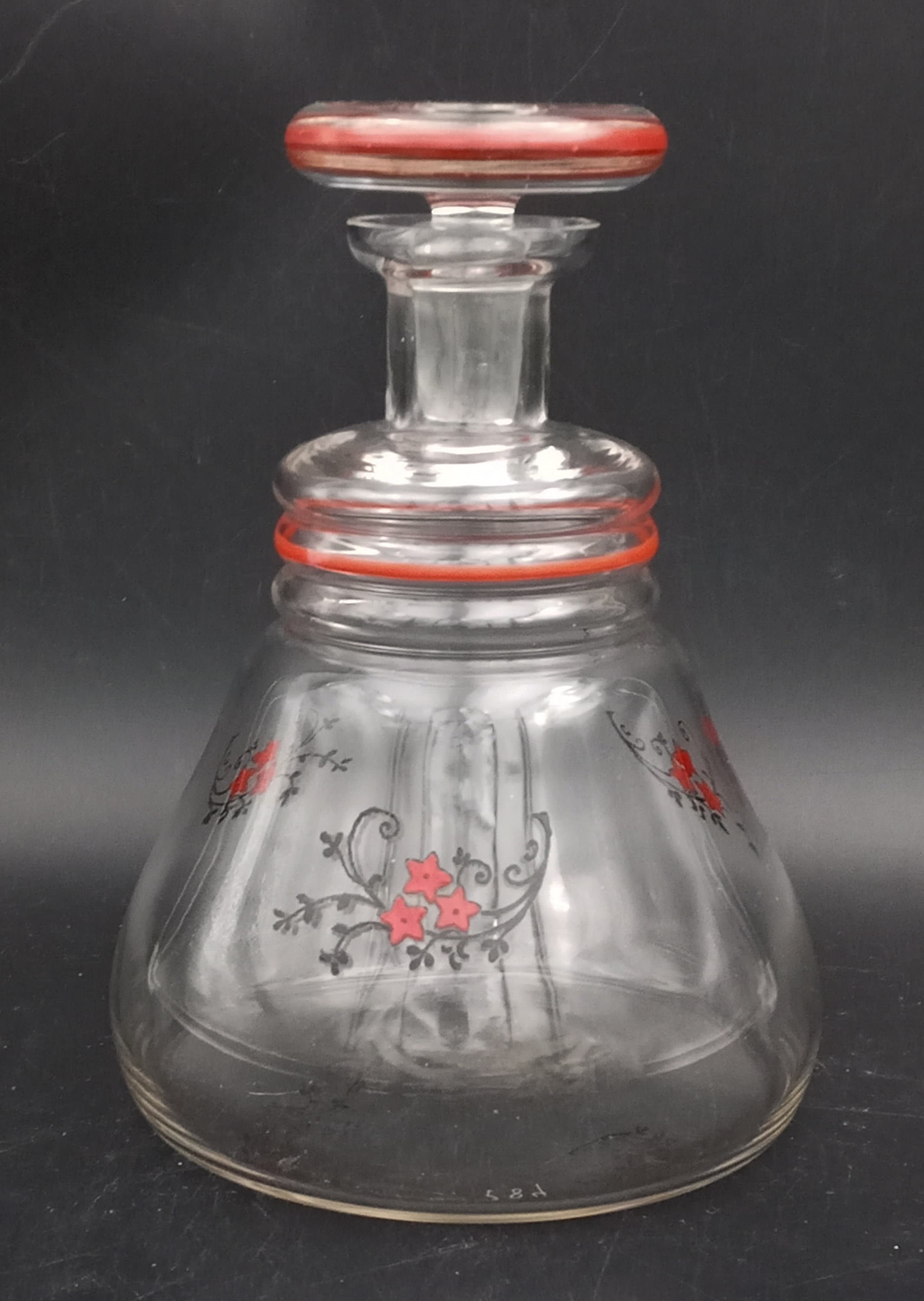 Superb vintage French glass carafe with red and black floral decoration.