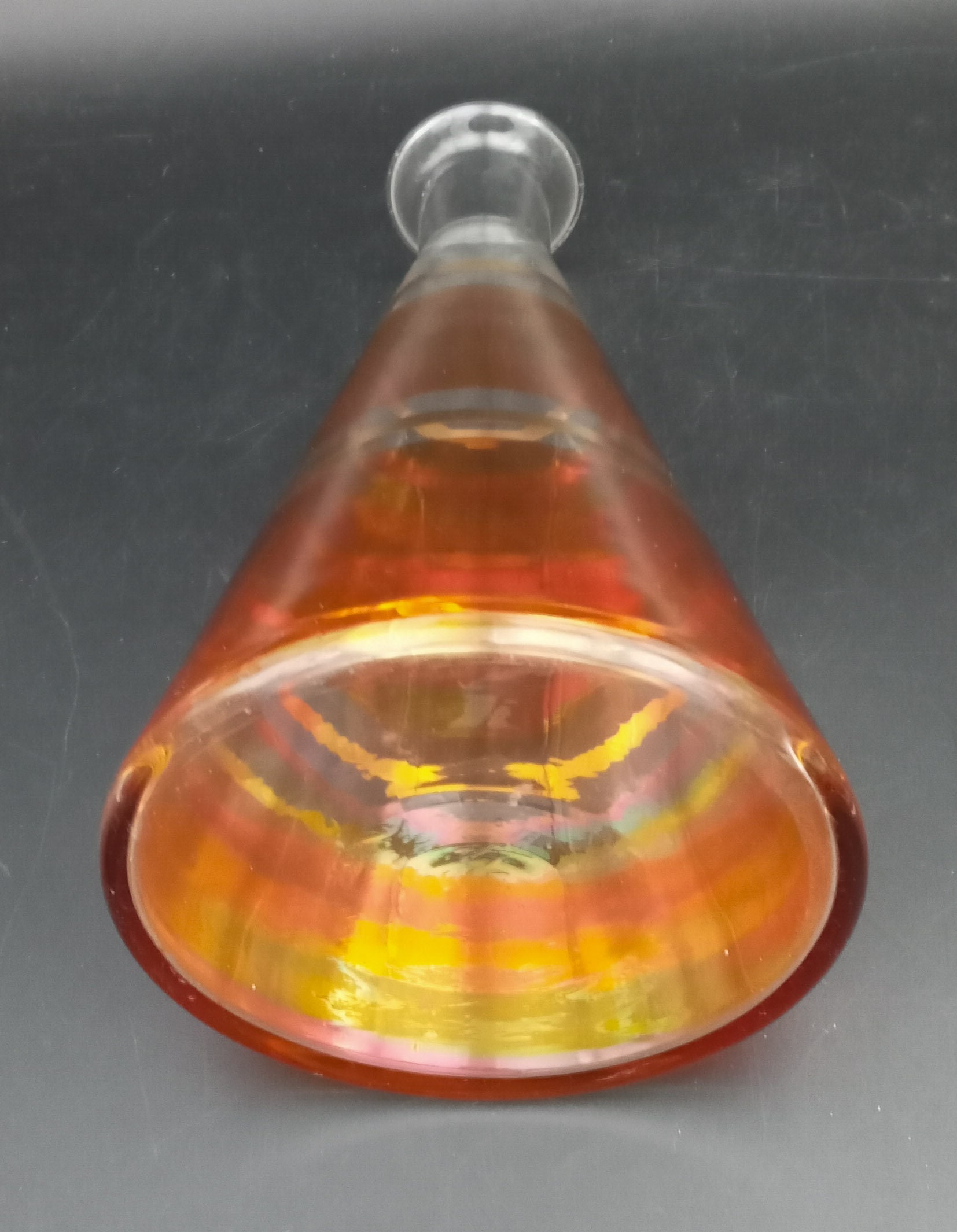 Conical orange carafe with gold trim; its clean lines and intense colors make it very modern.